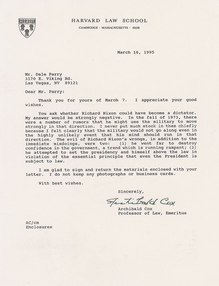 TLS, one page, 8.5 x 11, Harvard Law School letterhead, March 16, 1995. Letter to Dale Parry, in part: "You ask whether Richard Nixon could have become a dictator. My answer would be strongly negative. In the fall of 1973, there were a number of rumors that he might use the military to move strongly in that direction. I never put much stock in them chiefly because I felt clearly that the military would not go along even in the highly unlikely event that his mind should run in that direction. The evil of Richard Nixon's wrongs, in addition to the immediate misdoings, were two: (1) he went far to destroy confidence in the government, a trend which is running rampant; (2) he attempted to set the presidency and himself above the law in violation of the essential principle that even the President is subject to law." In fine condition.