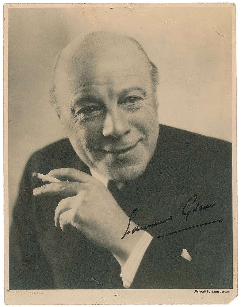 Vintage matte-finish 8 x 10.5 Raphael Tuck & Sons portrait of Edmund Gwenn smoking a cigarette, originally taken by photographer Janet Jevons, signed boldly in fountain pen. In very good to fine condition, with pin holes to the borders, tears to the top and bottom edges, and a missing lower right corner tip.
