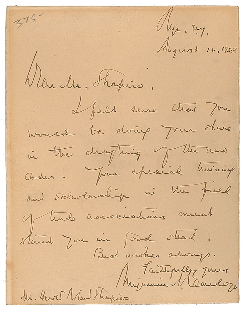 ALS signed “Benjamin N. Cardozo,” one page, 5.25 x 6.75, August 12, 1933. Letter to Harold Roland Shapiro, in full: "I felt sure that you would be doing your share in the drafting of the new codes. Your special training and scholarship in the field of trade associations must stand you in good stead." In very good to fine condition, with trimmed edges and toning from prior display.