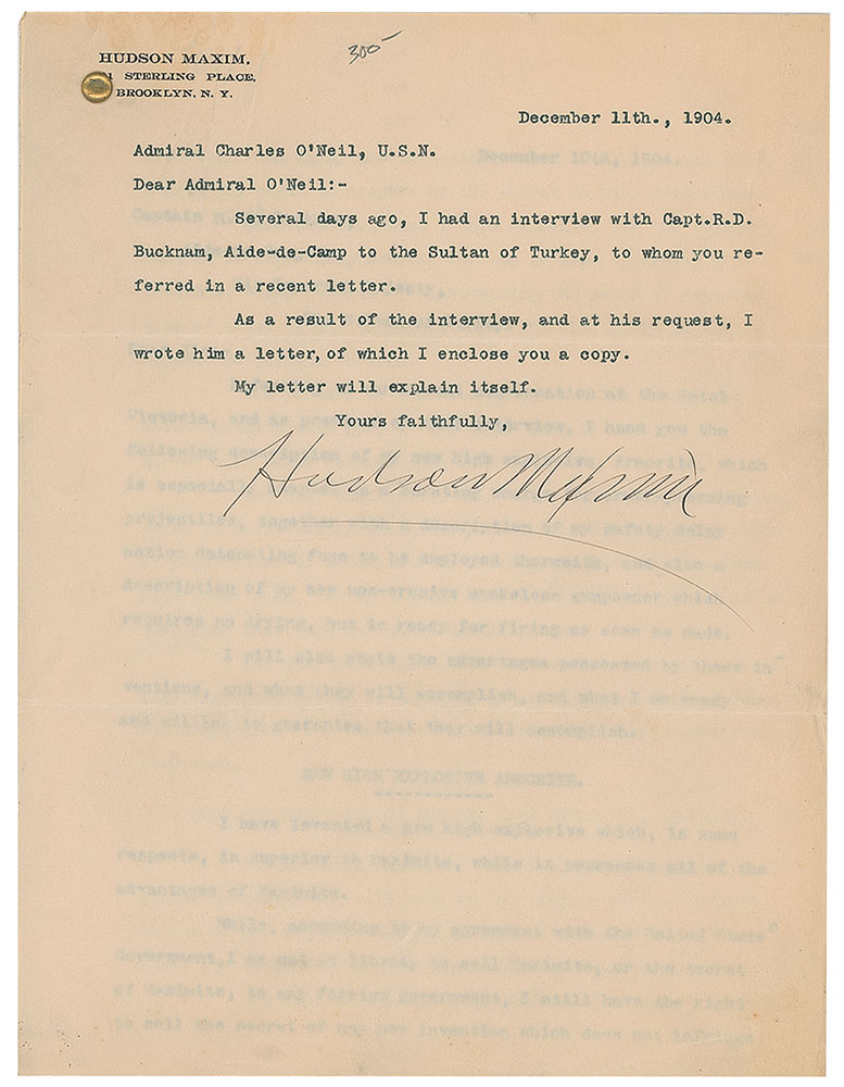 TLS, one page, 8 x 10.5, December 11, 1904. Letter to Admiral Charles O'Neil, in part: "Several days ago, I had an interview with Capt. R.D. Bucknam, Aide-de-Camp to the Sultan of Turkey, to whom you referred in a recent letter. As a result of the interview, and at his request, I wrote him a letter, of which I enclose you a copy." Attached is the eight-page copy of Maxim's letter to Bucknam (secretarially signed), containing descriptions of his "new high explosive, Armorite" and "new smokeless gunpowder." In fine condition, with light creasing and toning.