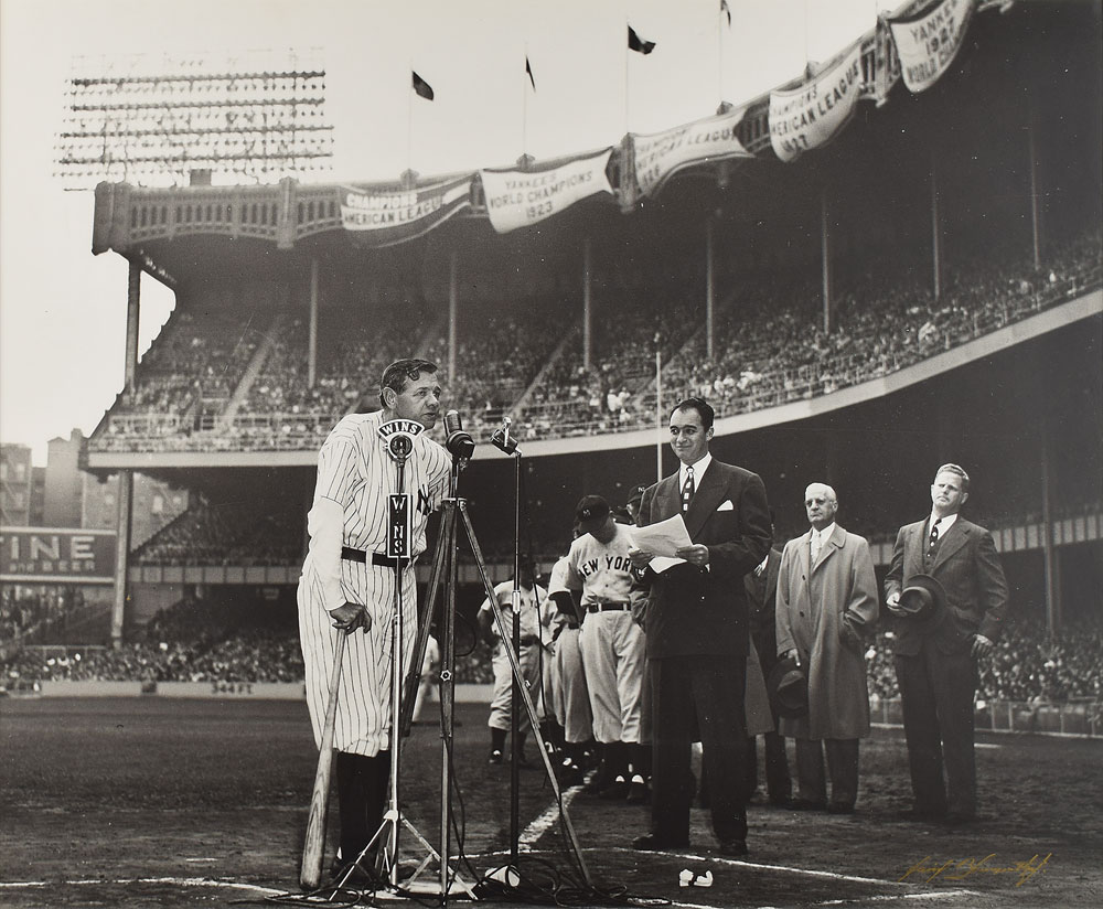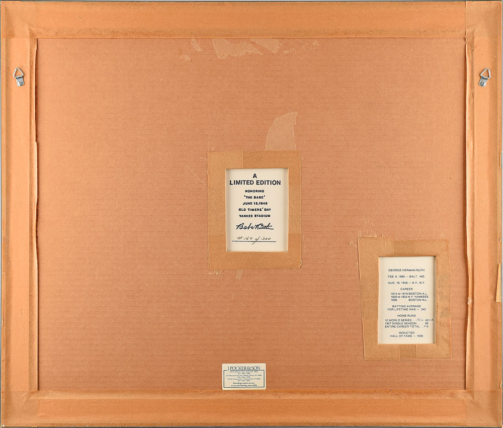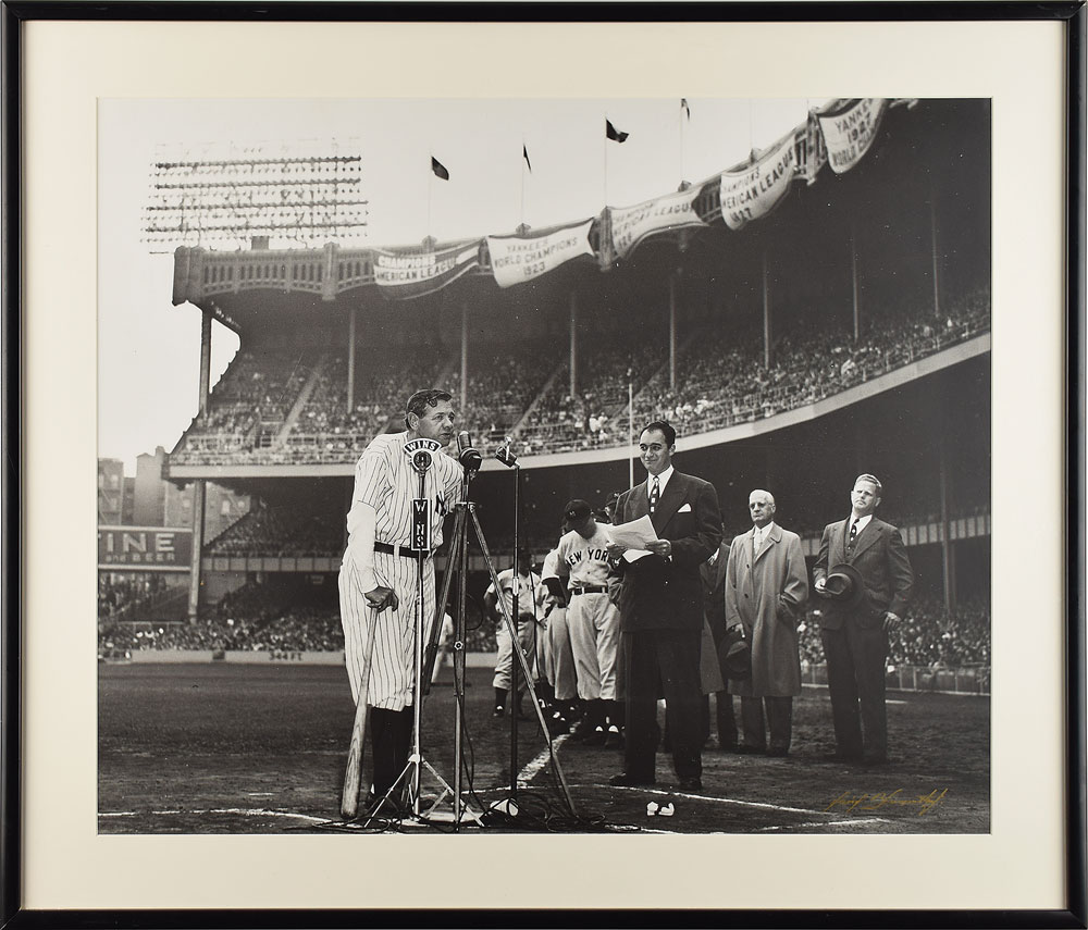 Impressive limited edition 23.25 x 19.25 photograph of Babe Ruth speaking at Yankee Stadium's Old Timers' Day on June 13, 1948, numbered 164/300, signed in the lower right corner in gold ink by photographer David Blumenthal. Attractively matted and framed to an overall size of 28.25 x 24.25. In fine condition.
