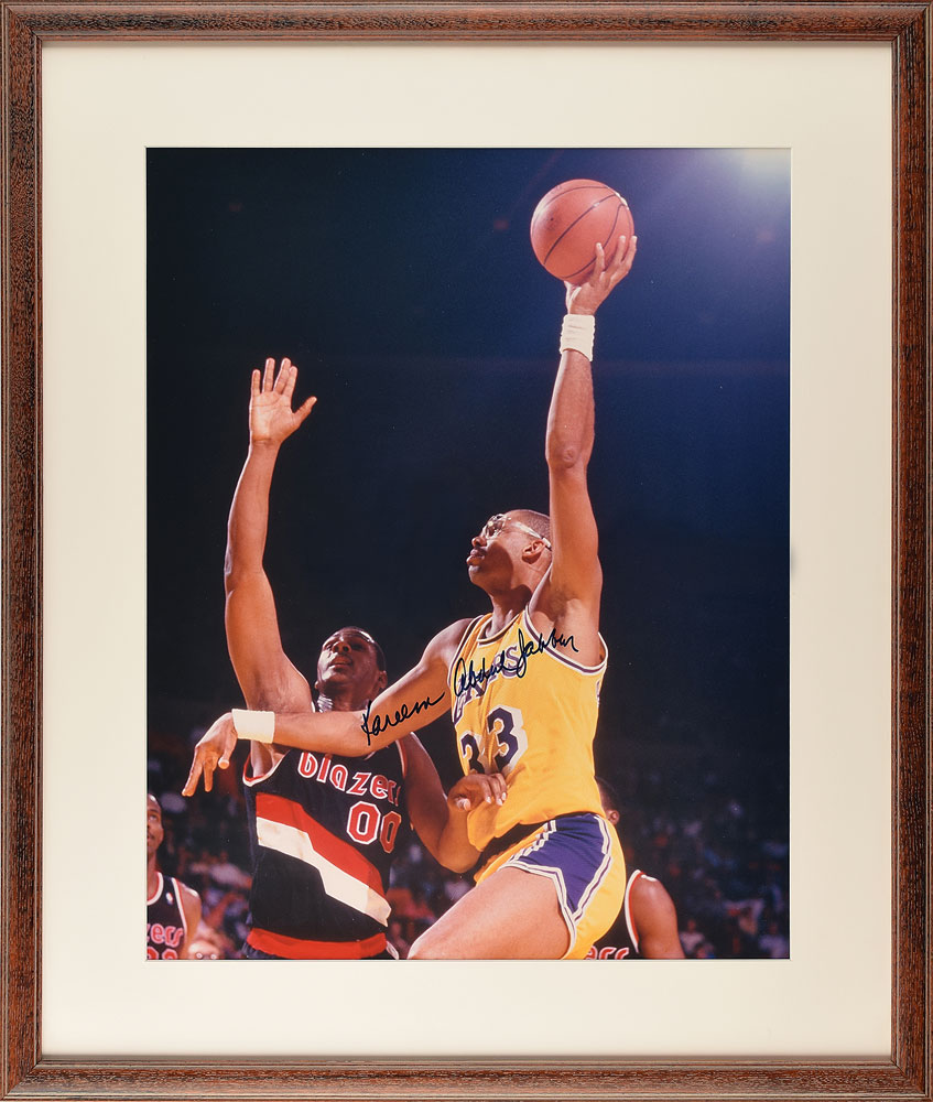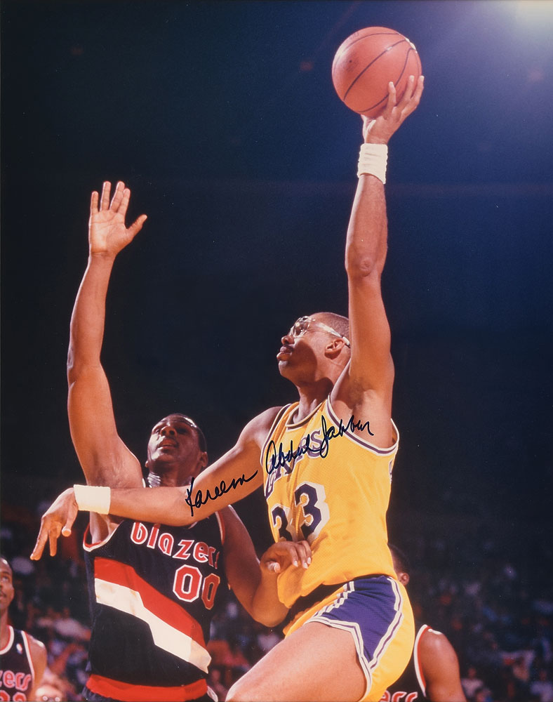 Color satin-finish 15.5 x 19.5 photo of Kareem Abdul-Jabbar delivering his trademark sky-hook against the Portland Trailblazers, signed in blue felt tip. Matted and framed to an overall size of 22.25 x 26.25. In fine condition.
