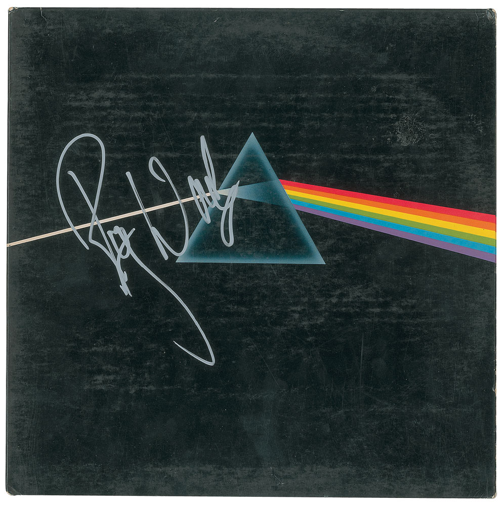 The Dark Side of the Moon album by Pink Floyd, signed nicely on the front cover in silver ink by Roger Waters. In fine condition, with light scuffing and some old price sticker residue. The record is included.