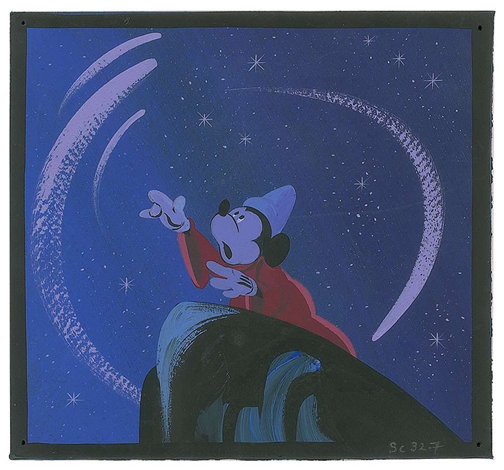 (Walt Disney Studios, 1940) Original concept painting of Mickey Mouse from the 'Sorcerer's Apprentice' segment of Fantasia, which shows the young wizard-to-be during his magical dream sequence: standing atop a pinnacle and wearing the mystical hat of the Sorcerer Yen Sid as he commands the stars and planets to dance across the heavens with the wave of his hands. Accomplished in gouache on black 7 x 6.5 artist's board, which is marked "SC 32.7" in the lower border. In fine condition. A brilliant up-close depiction of Mickey at his most powerful!
