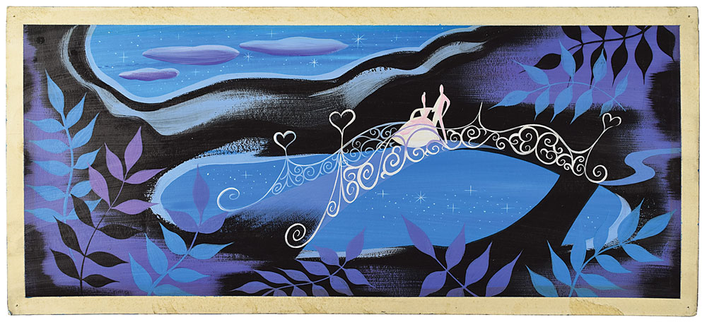 (Walt Disney Studios, 1950) Original concept painting by Mary Blair featuring Cinderella and Prince Charming from Cinderella, showing them standing atop a bridge behind the castle during their magical night. The impressive panorama features the couple in gleaming white at center, surrounded by dark purple, blue, and black hues of the night. Accomplished in tempera and watercolor on a 19.5 x 8.75 illustration board. In fine condition, with tack holes to corners. A stylish oversized piece from the hand of one of Disney's master concept painters.