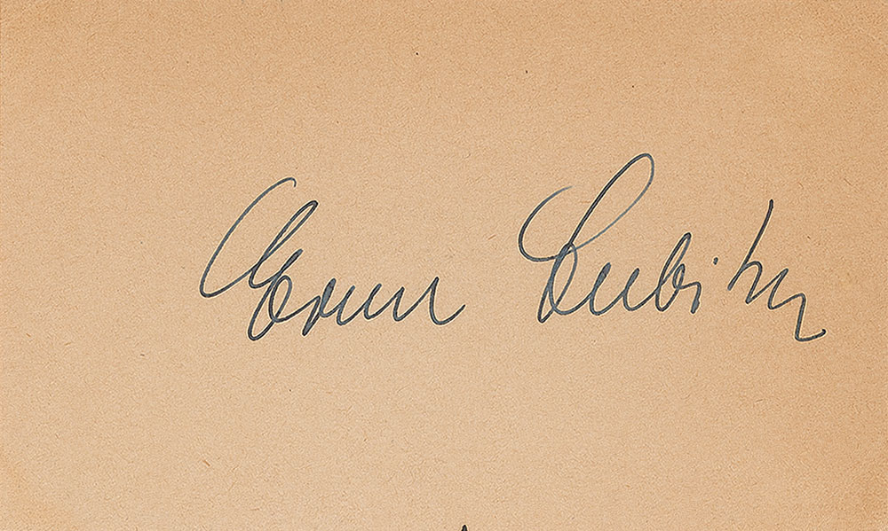 Legendary film director (1892-1947) best known for his sophisticated comedies and the fabled 'Lubitsch touch.' Vintage fountain pen signature, "Ernst Lubitsch,” on an off-white 5 x 3 card. In fine condition.