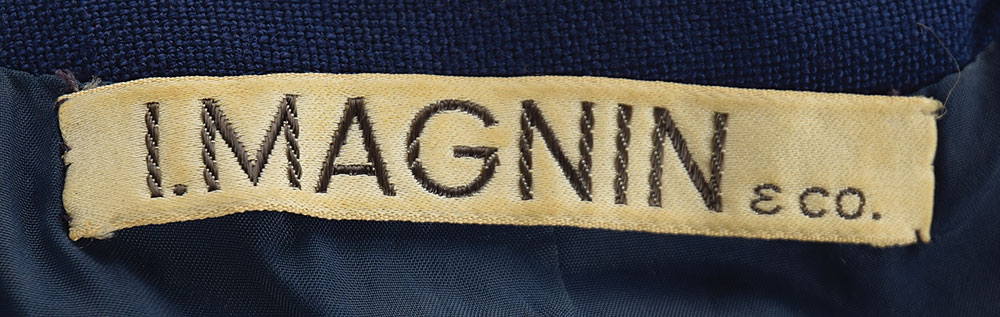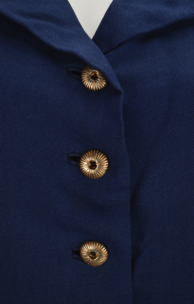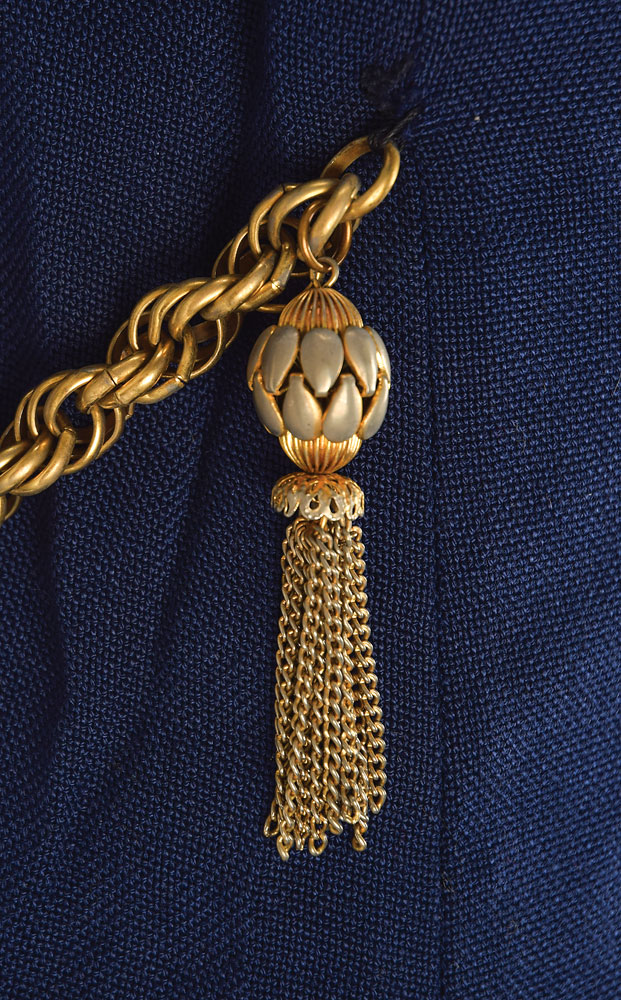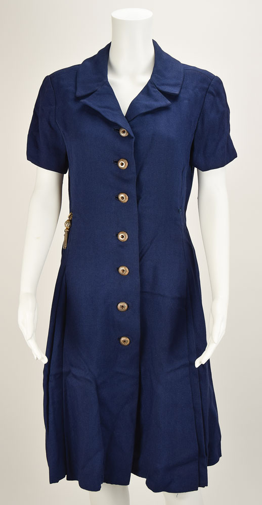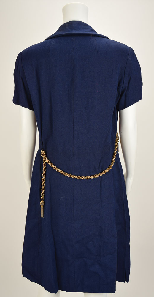 Elizabeth Taylor's personally-owned short-sleeve day dress by I. Magnin & Co. The navy blue cotton-blend dress features gold buttons on the front, and a gold chain waist belt with hanging globes and tassels. In overall fine condition. Provenance: Icons and Idols, Julien's Auctions, November 2013.
