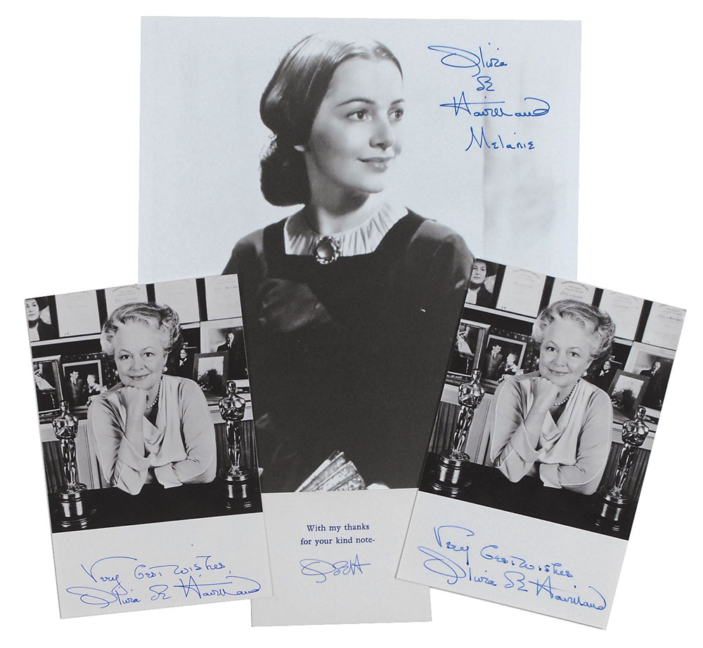 Four items: one glossy 8 x 10 photo of de Havilland as Melanie in Gone With the Wind, signed in blue felt tip; two glossy 4 x 6 photos of an older de Havilland, each signed in blue felt tip; and one printed note, signed with her initials in blue ink. In overall fine condition.