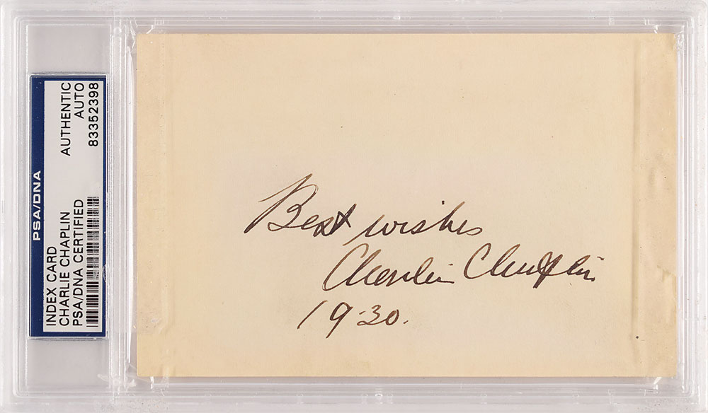Bold vintage fountain pen signature, "Best wishes, Charlie Chaplin, 1930,” on an off-white 5.5 x 3.5 card. In fine condition. Encapsulated in a PSA/DNA authentication holder.