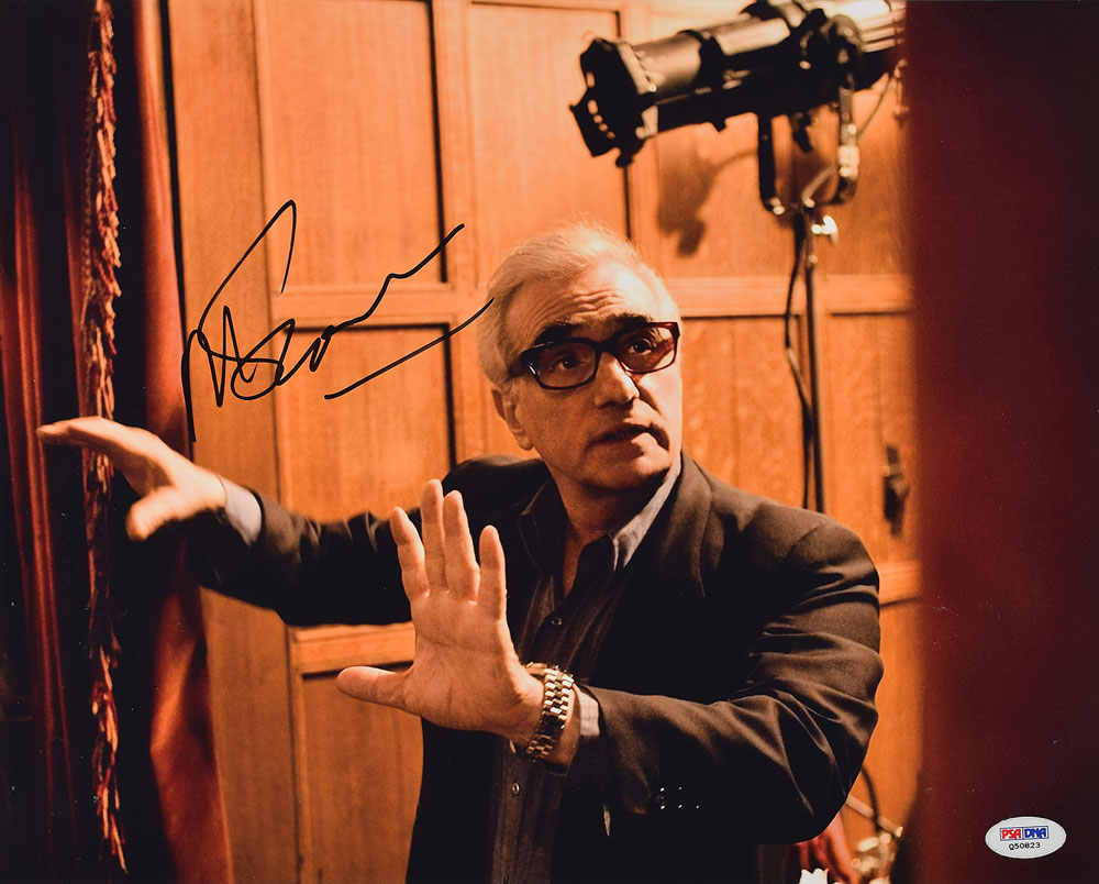 Color satin-finish 14 x 11 photo of Scorsese on set, signed in black felt tip. In fine condition, with a PSA/DNA label affixed to the lower corner (certificate of authenticity not present).