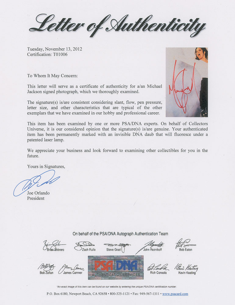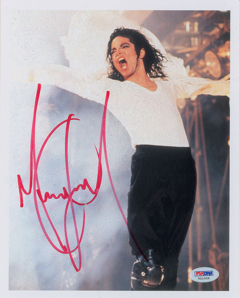 Color glossy 8 x 10 photo of Jackson energetically performing in concert, prominently signed in red felt tip. In very good to fine condition, with scattered small creases and a PSA/DNA label affixed to the lower corner. Accompanied by a full letter of authenticity from PSA/DNA.
