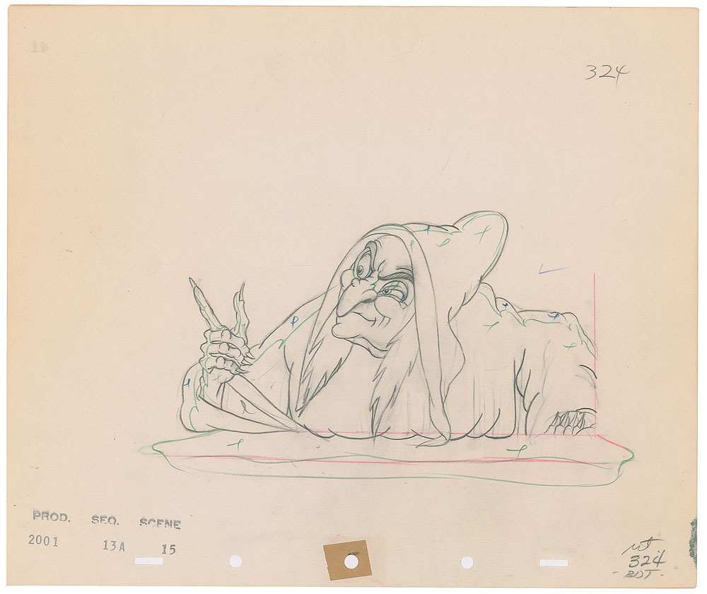(Walt Disney Studios, 1937) Original production drawing of the Evil Queen from Snow White and the Seven Dwarfs, showing the queen in her frightening old hag form with a bony outstretched finger. Accomplished in graphite and colored pencil on untrimmed 12 x 10 animation paper, which is marked in the lower right, "324." Stamped in the lower left, "Prod. 2001, Seq. 13A, Scene 15." Total image measures 8.25 x 4.5. In fine condition. Accompanied by a certificate of authenticity from Howard Lowery, which notes that Norm Ferguson, one of Walt Disney's top animators of the 1930s and 1940s, supervised the animation of this scene.