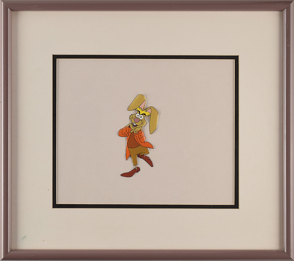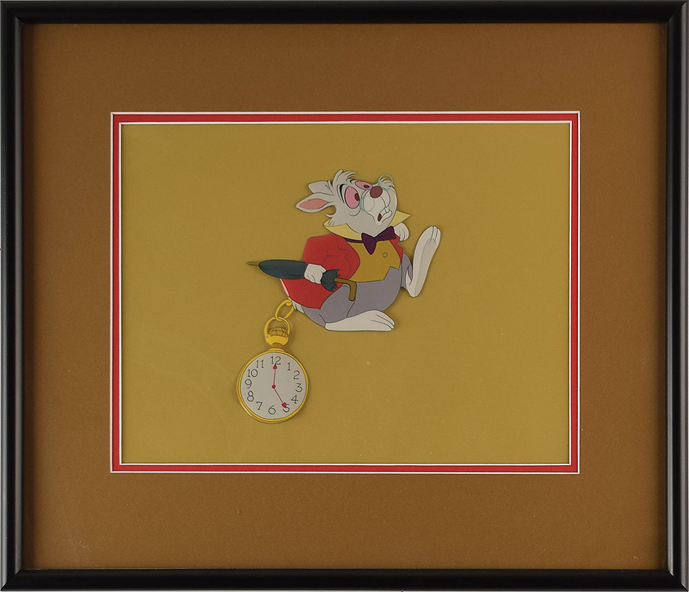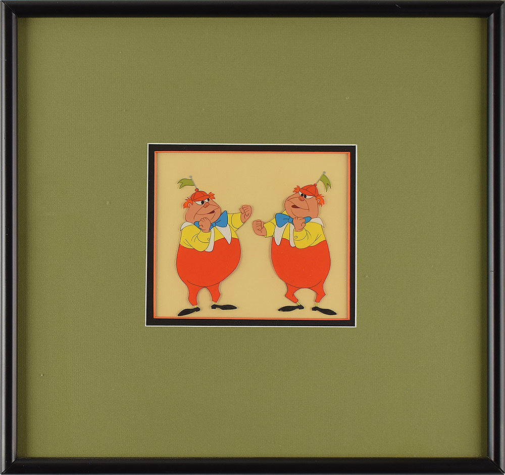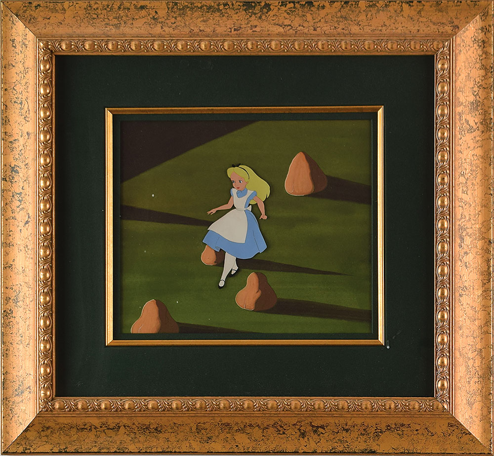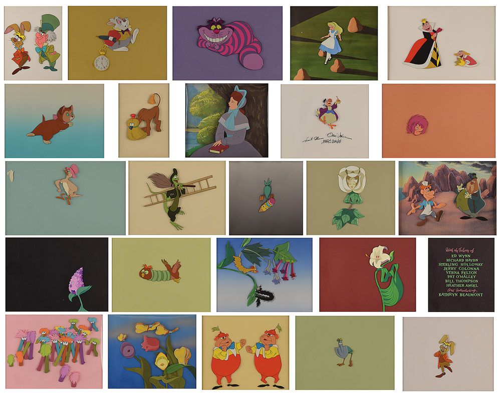 (Walt Disney Studios, 1951) Extraordinary collection of 25 original production cels from Alice in Wonderland, celebrating the rich diversity of memorable characters found in the adored Disney classic. The character cels, which range in size from 2.25 x 2 to 9 x 11, are as follows: Accordion Owl; Alice (2.75 x 5); Alice’s Sister; Bill the Lizard; Bread-and-Butterflies and Tulips; Broom Dog; Cheshire Cat (6.5 x 4.75); Credits for Voice Cast; Dinah; Dodo; Dog-Caterpillar and Cat-erpillar with Flowers; Hedgehog; Hyacinth; Lily; Mad Hatter and March Hare (3.25 x 7 and 3.25 x 6.5); March Hare; Mome Raths; Mother Bird; Pencil Bird; The Queen and King of Hearts (5.25 x 7 and 3 x 2.25); Shovel Bird; Tweedle Dee and Tweedle Dum (5.25 x 5); The Walrus and the Carpenter; White Rabbit with Watch; and the White Rose. Each character cel is matted, and all but two are framed, to sizes ranging from 8.75 x 11 to 22.75 x 18.75.