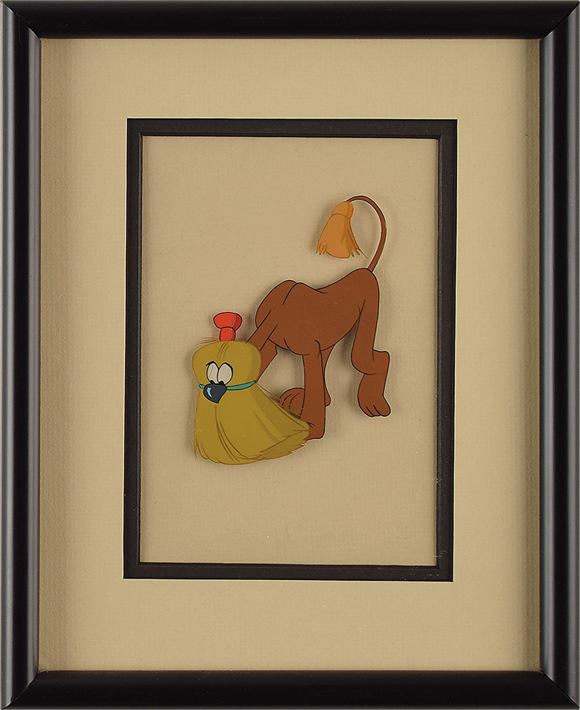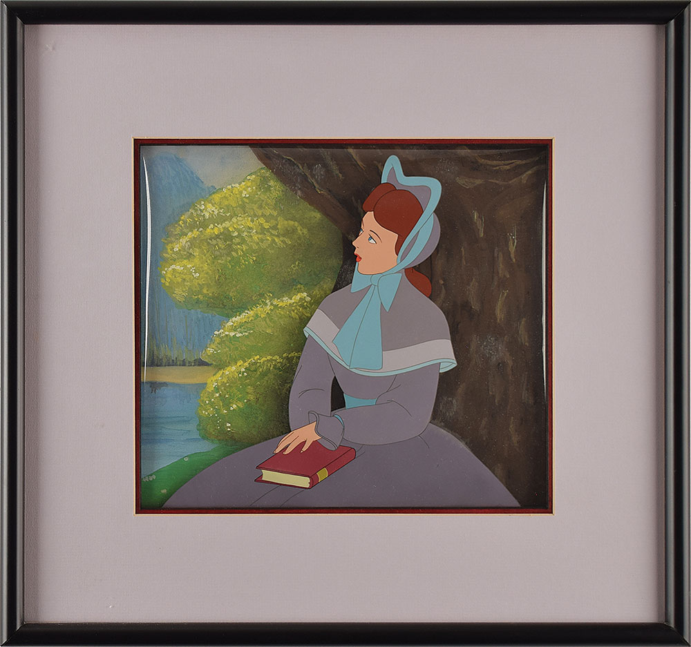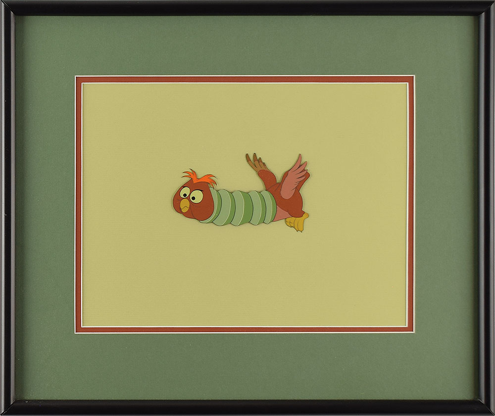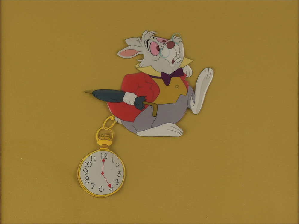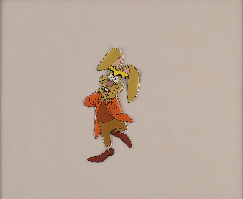 (Walt Disney Studios, 1951) Extraordinary collection of 25 original production cels from Alice in Wonderland, celebrating the rich diversity of memorable characters found in the adored Disney classic. The character cels, which range in size from 2.25 x 2 to 9 x 11, are as follows: Accordion Owl; Alice (2.75 x 5); Alice’s Sister; Bill the Lizard; Bread-and-Butterflies and Tulips; Broom Dog; Cheshire Cat (6.5 x 4.75); Credits for Voice Cast; Dinah; Dodo; Dog-Caterpillar and Cat-erpillar with Flowers; Hedgehog; Hyacinth; Lily; Mad Hatter and March Hare (3.25 x 7 and 3.25 x 6.5); March Hare; Mome Raths; Mother Bird; Pencil Bird; The Queen and King of Hearts (5.25 x 7 and 3 x 2.25); Shovel Bird; Tweedle Dee and Tweedle Dum (5.25 x 5); The Walrus and the Carpenter; White Rabbit with Watch; and the White Rose. Each character cel is matted, and all but two are framed, to sizes ranging from 8.75 x 11 to 22.75 x 18.75.