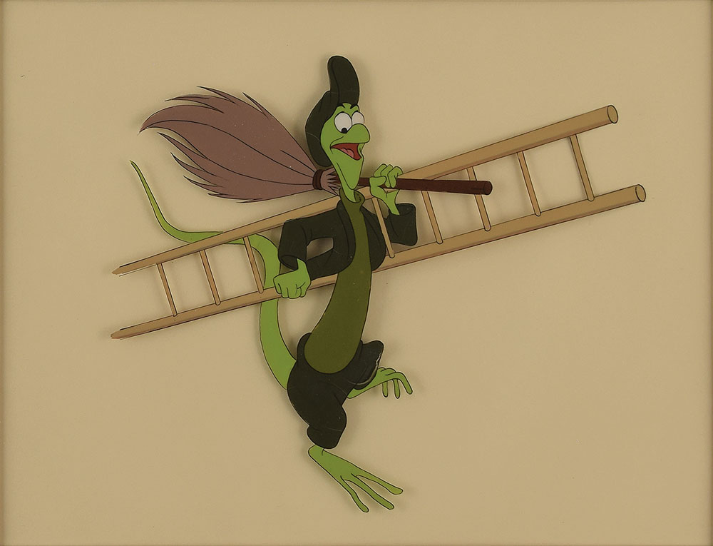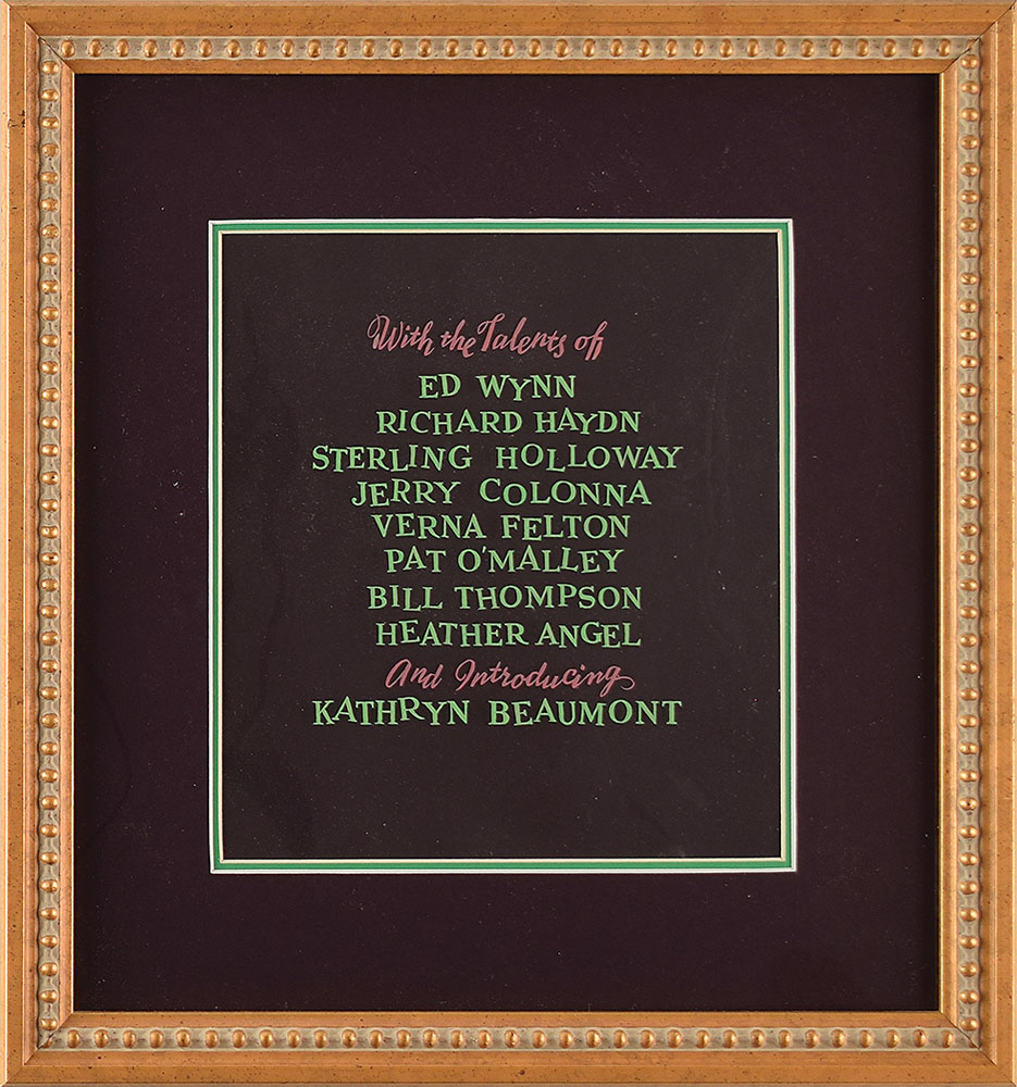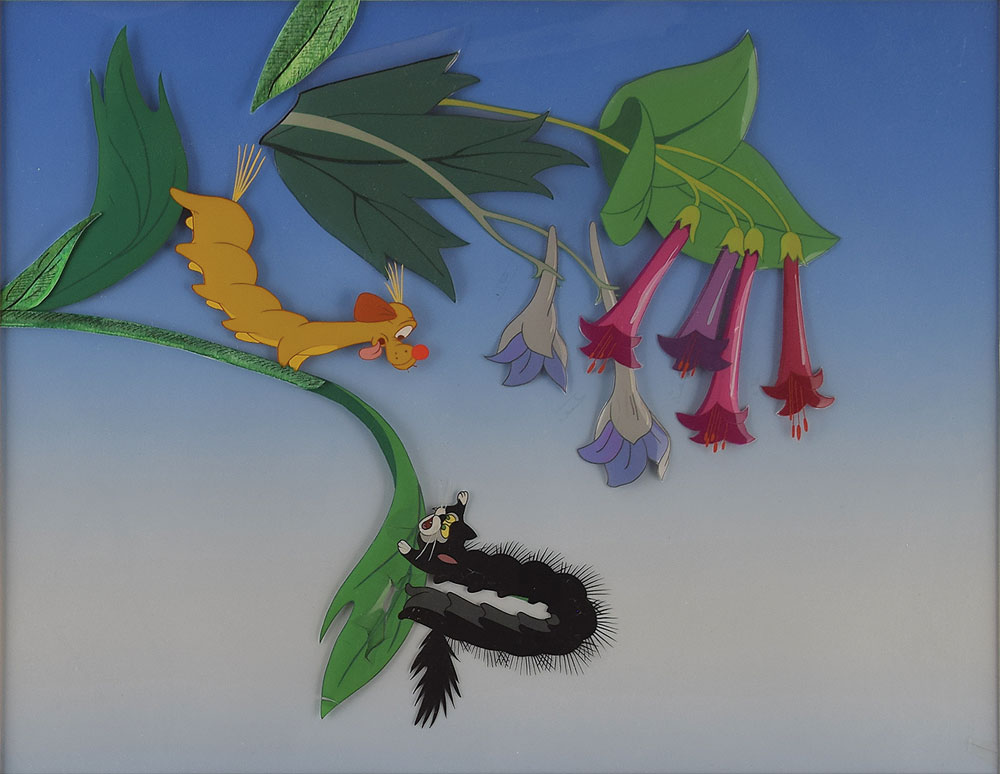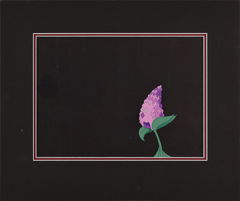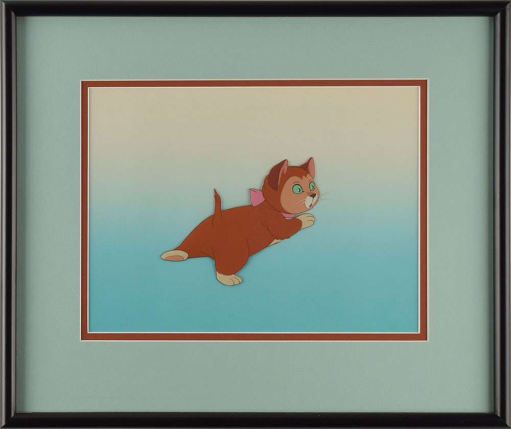 (Walt Disney Studios, 1951) Extraordinary collection of 25 original production cels from Alice in Wonderland, celebrating the rich diversity of memorable characters found in the adored Disney classic. The character cels, which range in size from 2.25 x 2 to 9 x 11, are as follows: Accordion Owl; Alice (2.75 x 5); Alice’s Sister; Bill the Lizard; Bread-and-Butterflies and Tulips; Broom Dog; Cheshire Cat (6.5 x 4.75); Credits for Voice Cast; Dinah; Dodo; Dog-Caterpillar and Cat-erpillar with Flowers; Hedgehog; Hyacinth; Lily; Mad Hatter and March Hare (3.25 x 7 and 3.25 x 6.5); March Hare; Mome Raths; Mother Bird; Pencil Bird; The Queen and King of Hearts (5.25 x 7 and 3 x 2.25); Shovel Bird; Tweedle Dee and Tweedle Dum (5.25 x 5); The Walrus and the Carpenter; White Rabbit with Watch; and the White Rose. Each character cel is matted, and all but two are framed, to sizes ranging from 8.75 x 11 to 22.75 x 18.75.