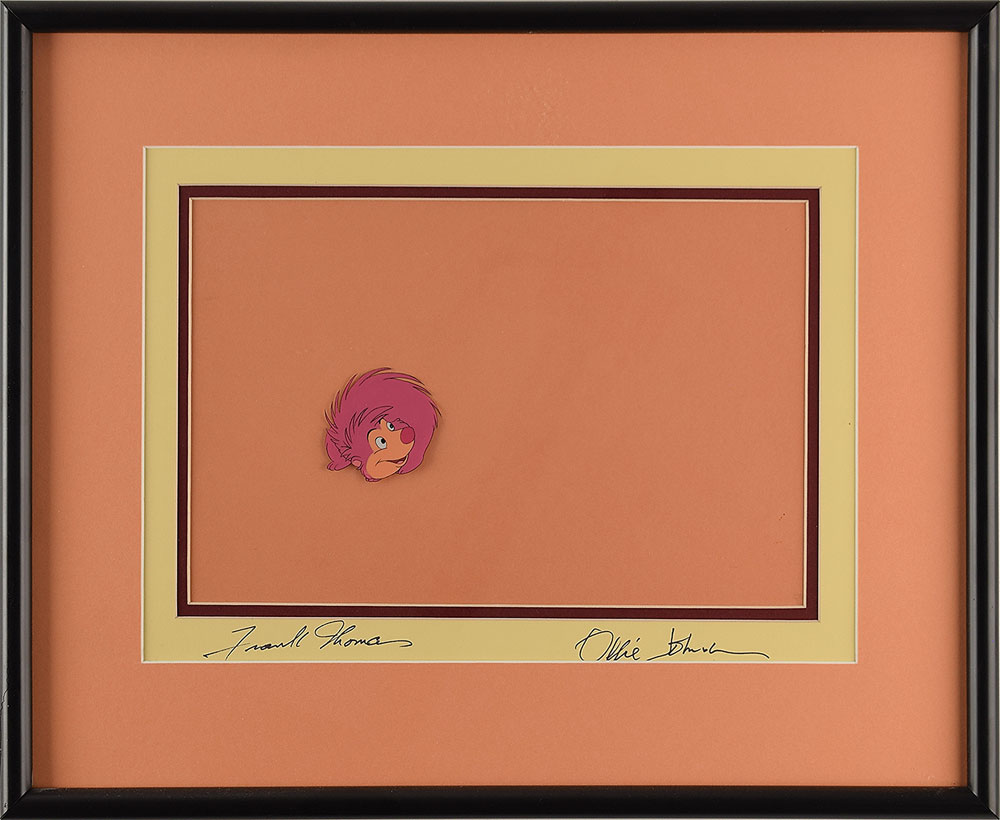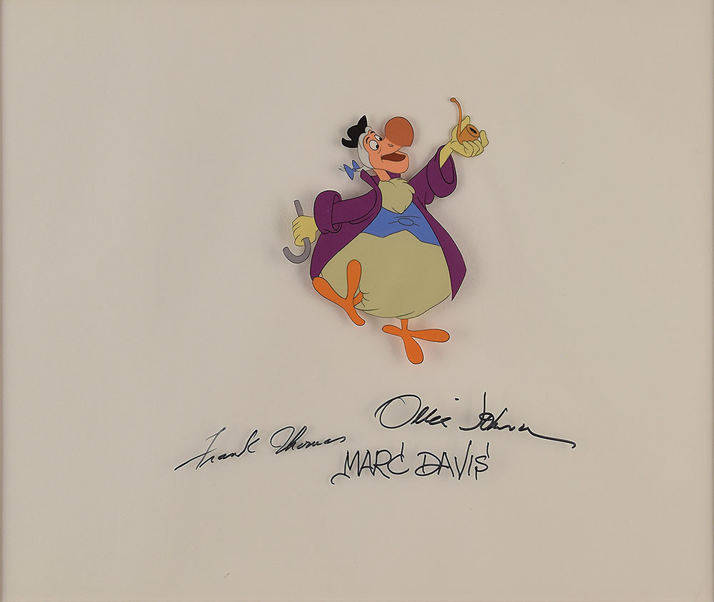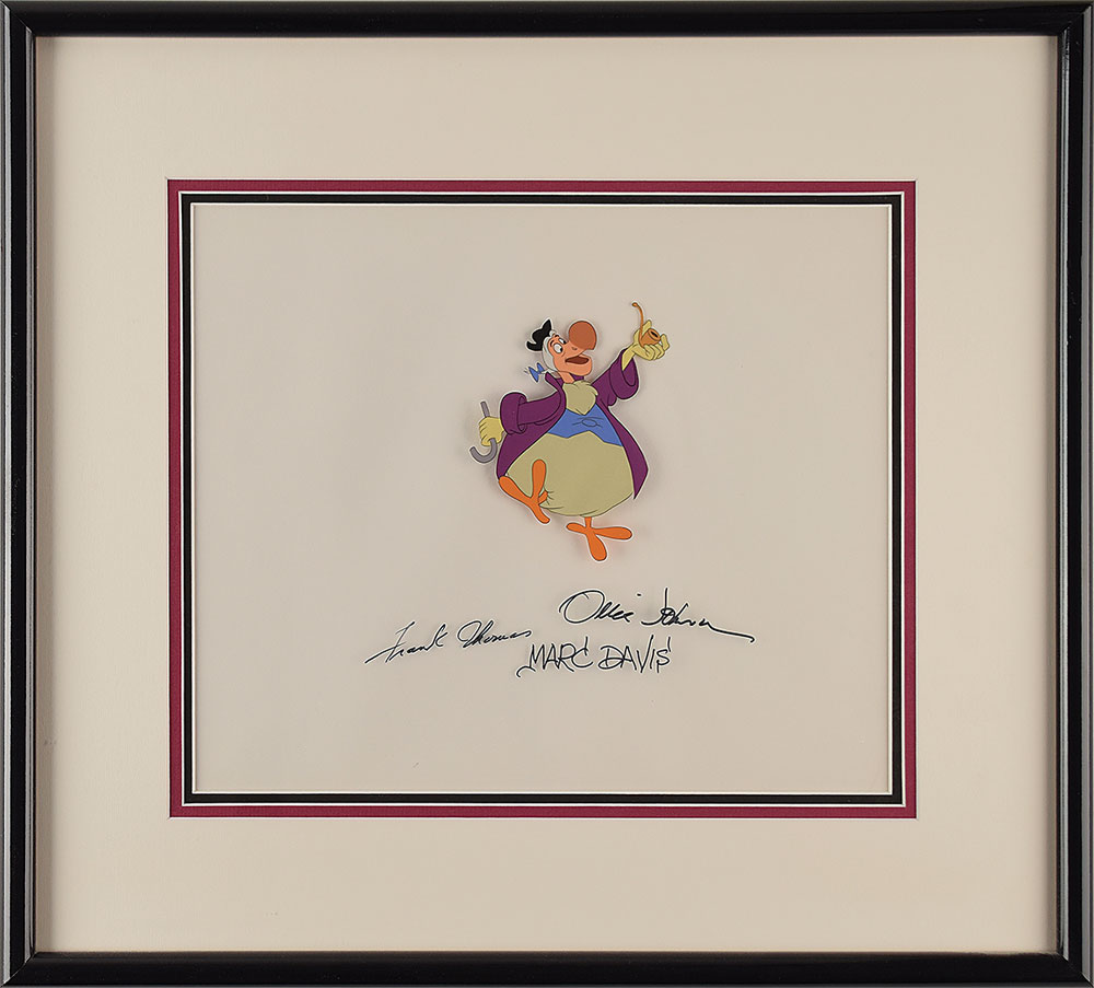The majority of the cel backgrounds are either plain or of the airbrushed variety, however, the Alice cel is placed on a custom prepared hand-painted background, and Alice’s Sister cel is placed on a matching hand-painted background that also includes the original mat with Walt Disney seal. Additionally, the mat for the Dodo cel is signed in black felt tip by esteemed Disney animators Marc Davis, Frank Thomas, and Ollie Johnston, with the latter two also signing the mat for the purple Hedgehog cel. In overall fine condition, with some instances of lifting and cracking to the paint, most notably to the Mother Bird and Cat-erpiller cels. Accompanied by a third printing of the Gold Key comic book for Walt Disney’s Alice in Wonderland, and a hardcover copy of the Golden Press book Walt Disney’s Alice in Wonderland: A Big Golden Book.