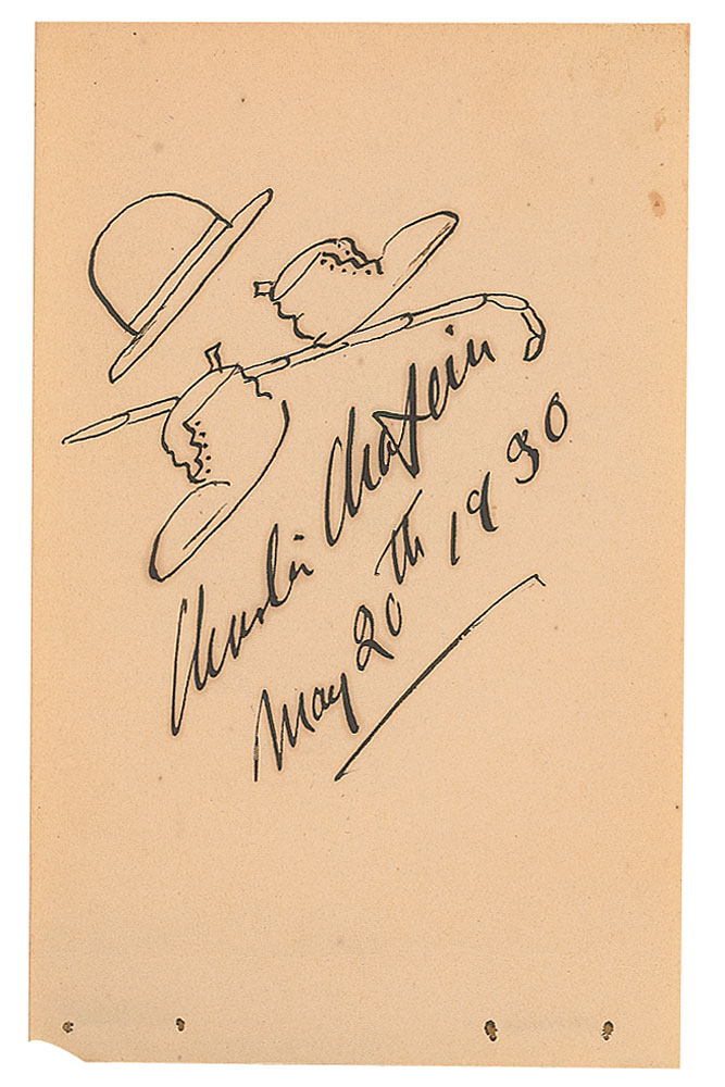 Bold fountain pen signature, "Charlie Chaplin, May 20th, 1930," who adds brilliant sketches of a bowler hat, bamboo cane, and dress shoes on an off-white 3.75 x 5.75 album page. In fine condition. A decidedly bold and crisp signature with appealing 'Tramp' outfit drawings dating to production of the silent masterpiece City Lights.