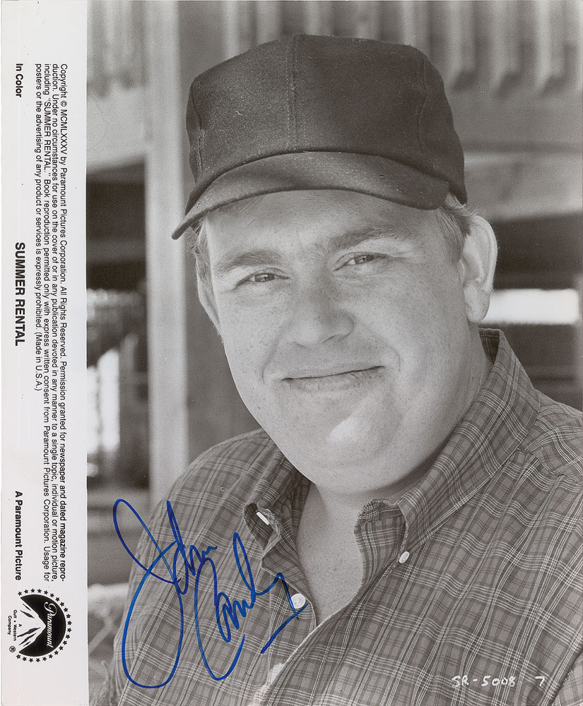 Uncommon glossy 8 x 9.75 Paramount Pictures publicity photo of Candy as Jack Chester in the 1985 film Summer Rental, signed in blue felt tip. Reverse bears an affixed Paramount Pictures publicity sheet for the Carl Reiner film. In fine condition.