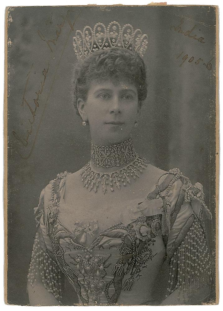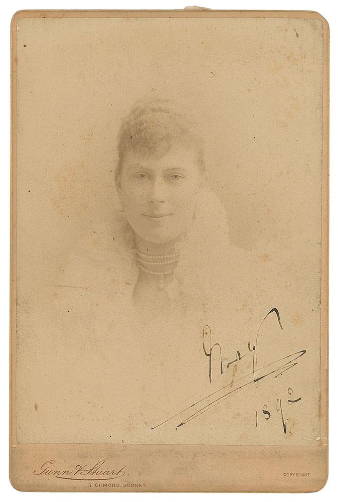 Two cabinet photos: one 4.25 x 6.5 cabinet photo showing her looking straight ahead by Gunn & Stuart, signed in ink, "May, 1892"; and one 4 x 5.5 cabinet photo of her dressed in royal regalia by W. & D. Downey, signed in ink, "Victoria Mary, India, 1905-6." In very good to fine condition, with scattered light foxing to the larger photo, and light scuffing and a corner crease to the smaller photo.