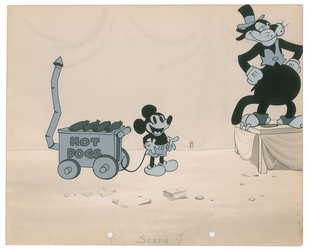 (Walt Disney Studios, 1929) Remarkable and hugely desirable original production background from The Karnival Kid, the ninth ever Mickey Mouse animated short film, with a custom-prepared hand-painted cel depicting Mickey as a hot dog vendor at a carnival, with Kat Nipp, a barker at the carnival, standing on a platform nearby with his arms akimbo; this cel was made later by the Disney Studio for a display at a 2001 Ronald Reagan Museum exhibit. The custom cel is placed on the original hand-inked and -painted production background from The Karnival Kid, which is marked "Scene 7" in the lower border. Character images measure 5.25 x 5 (Mickey and cart) and 2.75 x 5 (Kat Nipp), with overall dimensions of 11.75 x 9.5. In fine condition. Accompanied by a certificate of authenticity from Ron Stark of S/R Laboratories, who affirms that this cel and background set-up was "proudly displayed in 'Walt Disney: The Man and His Magic,' May 13 to September 4, 2001, at the Ronald Reagan Presidential Library and Museum." In addition to its fantastic imagery, this important background derives from a notably historic Mickey Mouse cartoon: The Karnival Kid was the first cartoon to feature Mickey speak ('Hot dog! Hot dog!') and the scene where Mickey tips his ears to Minnie inspired storyman Roy Williams to invent the Mickey Mouse ears hat.