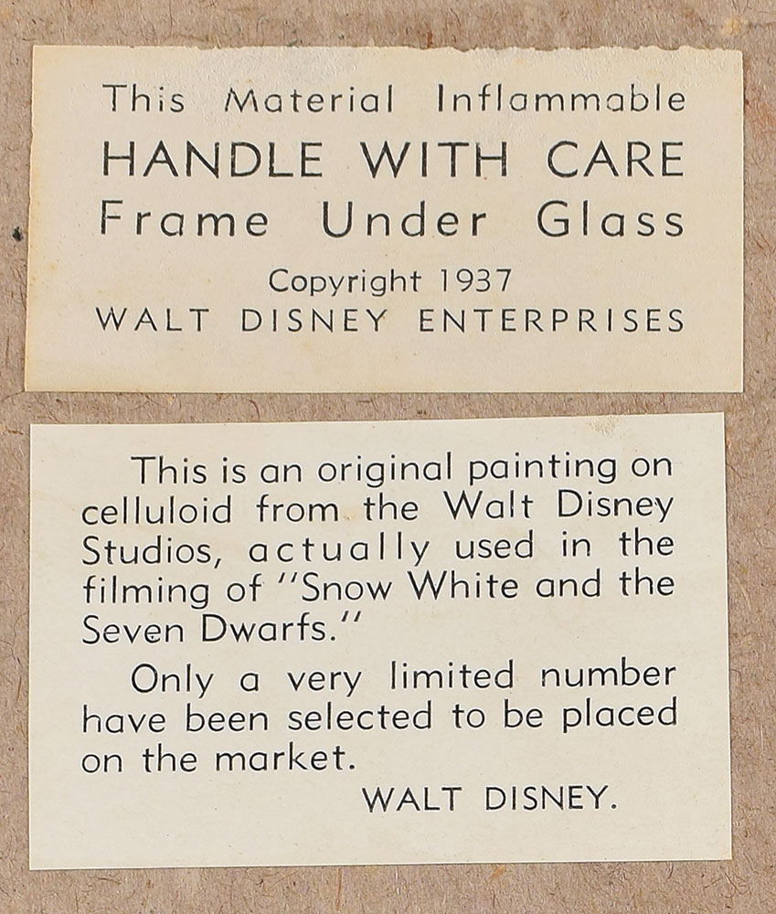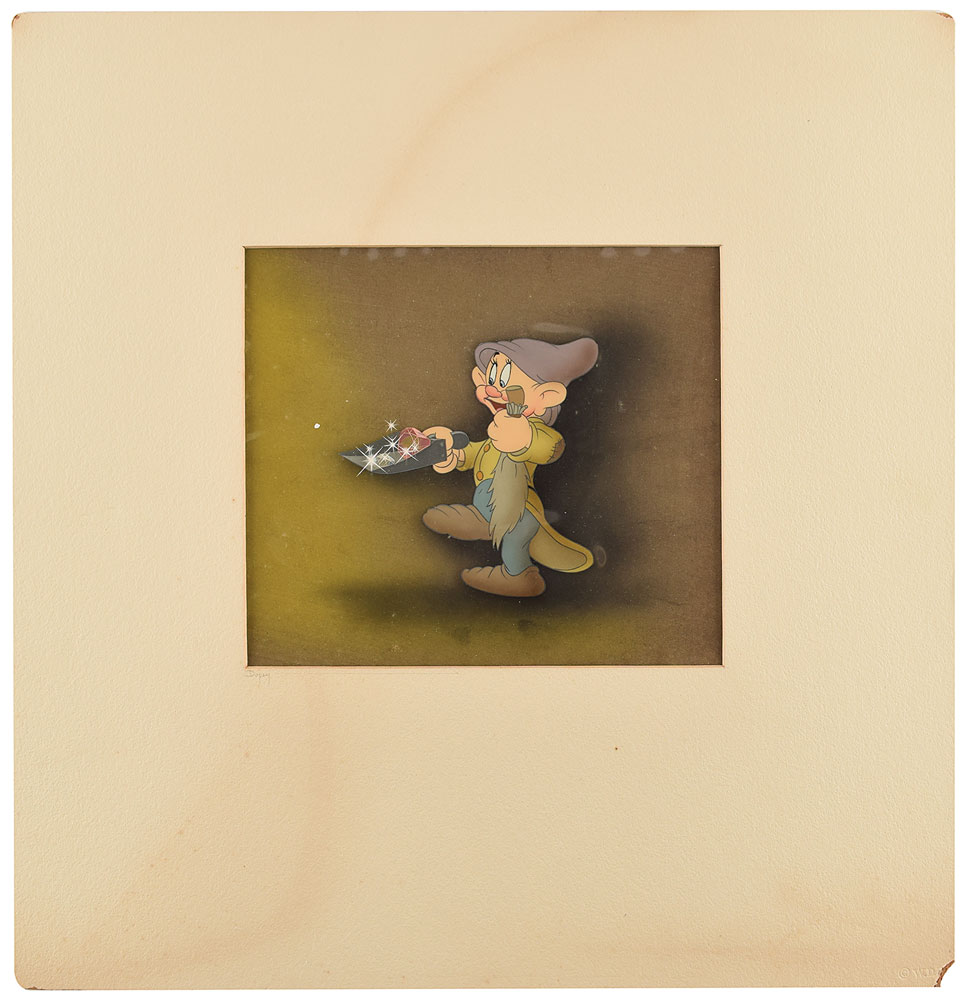 (Walt Disney Studios, 1937) Superb original production cel featuring Dopey from Snow White and the Seven Dwarfs, showing him scooping up sparkling diamonds in the mine. The cel has been trimmed and applied to an airbrushed background as prepared by Courvoisier Galleries for sale. Image measures 4.5 x 4.25, with a mat opening of 8 x 7. Matted to an overall size of 16 x 16.5. The piece has the original Disney Courvoisier Galleries label on the reverse. In fine condition, with a chip to the lower right corner of the mount.