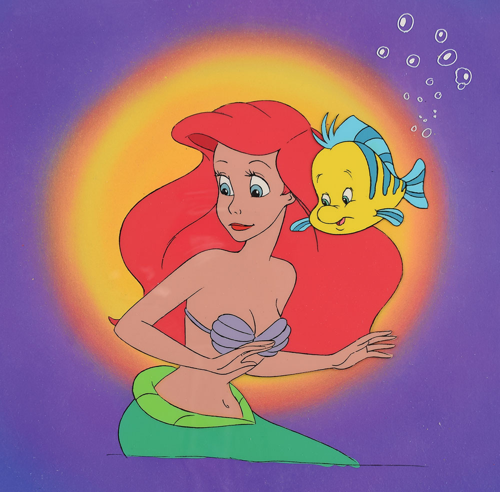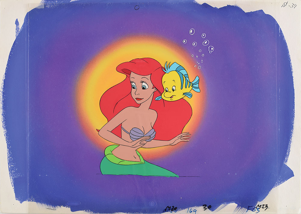 (Walt Disney Studios, 1992) Beautiful original production cels and production background of Ariel and Flounder from The Little Mermaid television series. The cels are stapled to a hand-painted production background from the same film, which is marked "S-39" in the upper right corner. Character images measure 4.5 x 5.75 (Ariel) and 3.25 x 3.75 (Flounder with bubbles), with overall dimensions of 15 x 10.75. In fine condition. A gorgeous, vibrantly colored production set-up of Ariel and Flounder ready for framing.