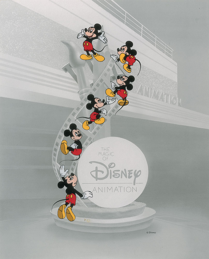 (Walt Disney Studios, circa 1990-1995) Original limited edition hand-painted cel featuring Mickey Mouse climbing up a film strip, the third cel released in the Magic of Disney Animation series, sold exclusively at Walt Disney World/MGM Theme Park in Florida. The cel is placed on a printed 'The Magic of Disney Animation' background, with overall dimensions of 10.5 x 13. In fine condition.