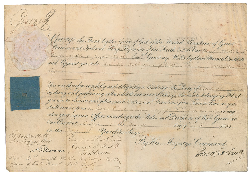 Partly-printed vellum DS, signed “George R.,” one page, 13.5 x 9.25, April 7, 1804. King George appoints "Lieutenant Colonel Joseph Walker?to be Inspecting Field Officer of Gentlemen Yeomanry & Volunteer Corps." Signed in the upper left corner by King George III, with original white and blue paper seals affixed below. In very good to fine condition, with light soiling, and some wrinkling to the upper right corner.