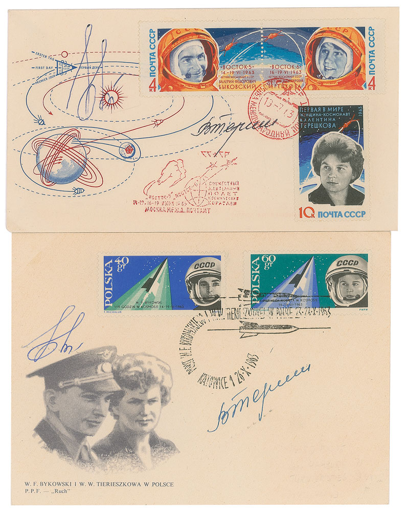 Attractive pair of Soviet commemorative covers with cachets and stamps honoring the joint Vostok 5 and 6 missions, 6.25 x 4.5 and 6.5 x 3.75, both signed in ink or ballpoint by Valery Bykovsky and Valentina Tereshkova. In overall fine condition.