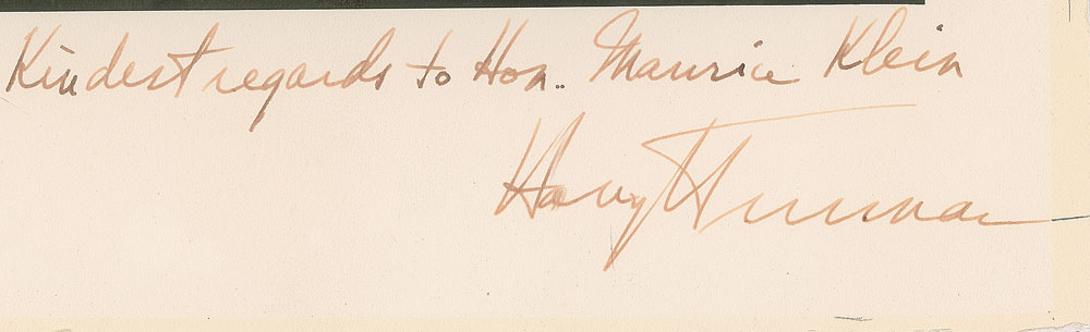 Handsome vintage matte-finish 9.5 x 12.25 photo of the 33rd American President, signed and inscribed in fountain pen, "Kindest regards to Hon. Maurice Klein, Harry S. Truman.” Affixed to a same-size mount. In fine condition, with trimmed edges.