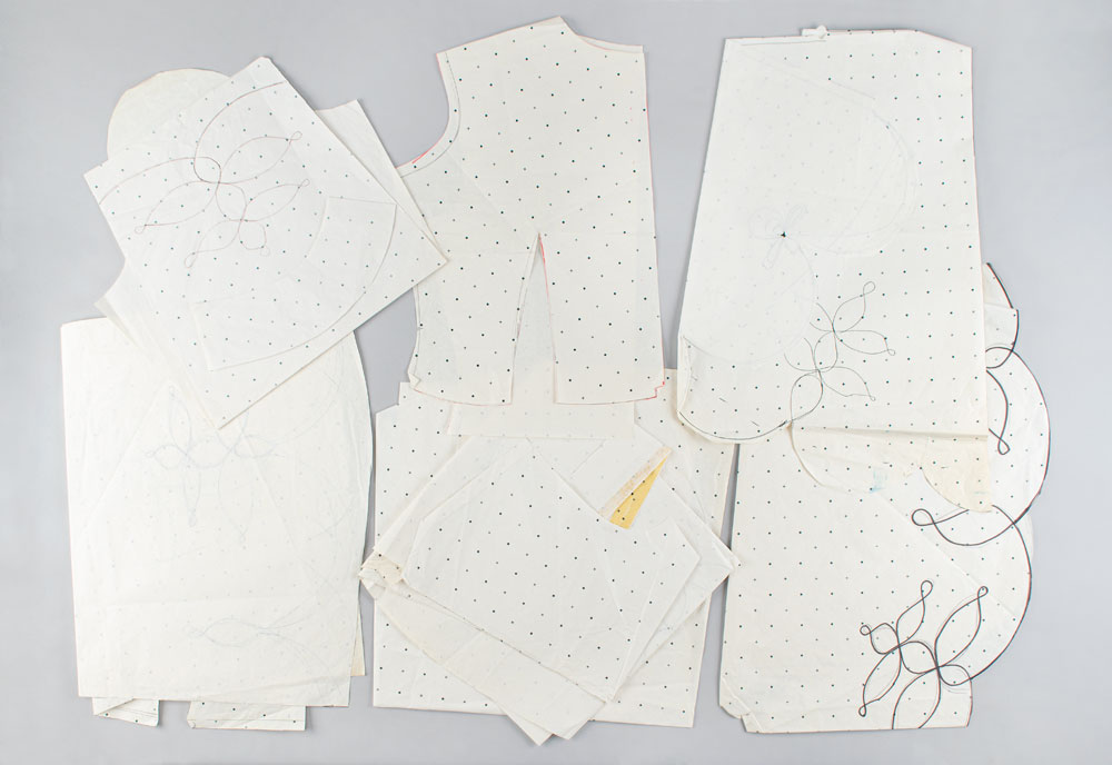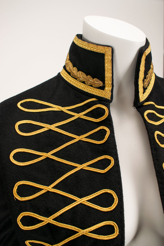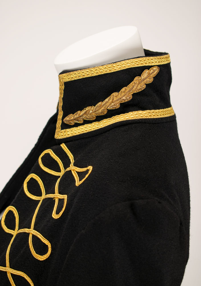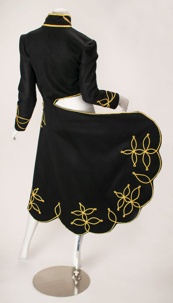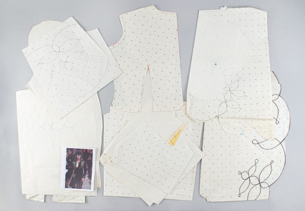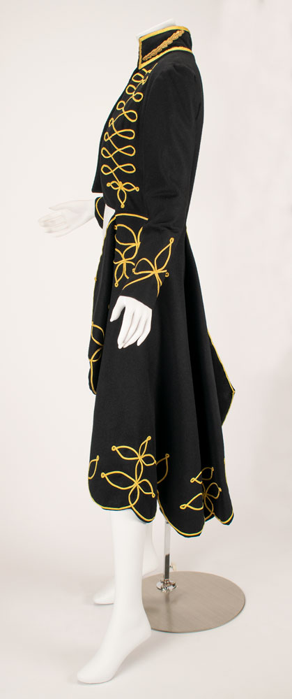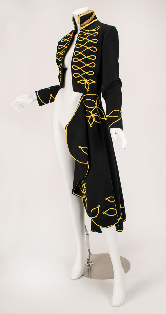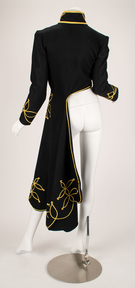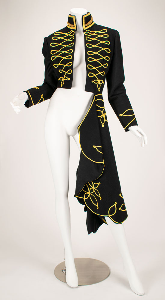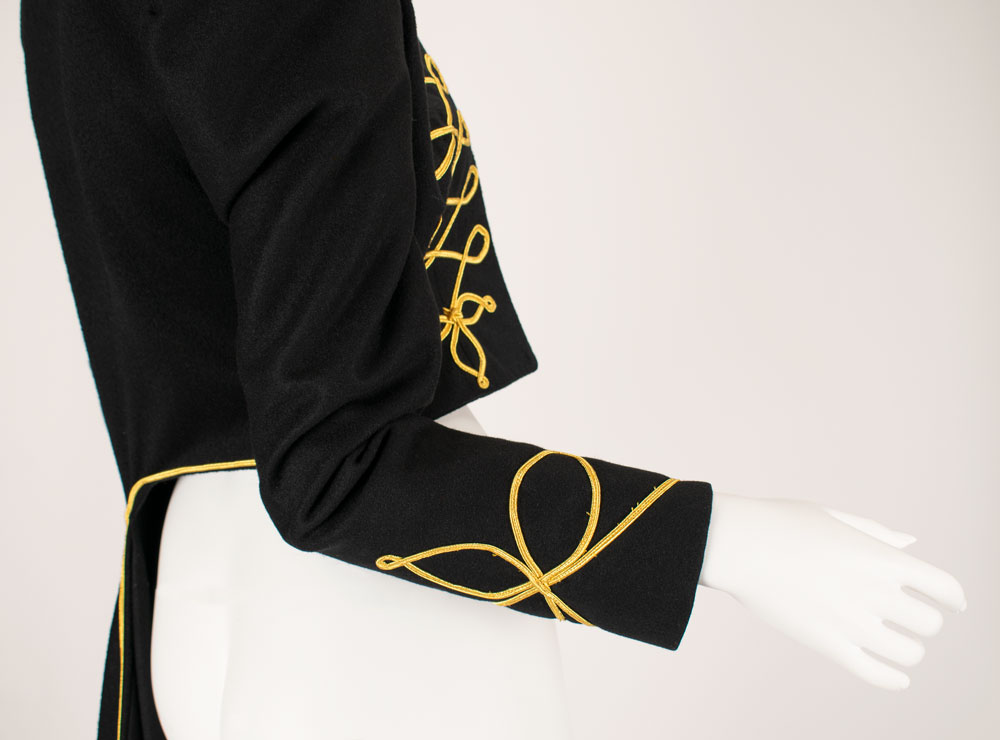 An exquisite and documented wool and cashmere military matador-style asymmetrical tailcoat with extensive gold braid work detailing. The military braiding decorates the high collar with 14 karat goldwork leaf detail emblems. Extensive braiding accents the chest and the scalloped edges of the tailcoat with three leafed gold swirl motifs. Also featured are straight sleeves with braid detailed cuffs and signature McQueen padded shoulder. A stunning example of single panel construction which makes up the entire top panel and "tail" portion showcasing McQueen design mastery. This very rare early example of McQueen tailoring is a slight variant of the runway version and was photographed by Nick Knight and styled by Katy England for the Spring 2015 issue of Another magazine in tribute to Lee Alexander McQueen prior to the opening of "Alexander McQueen: Savage Beauty" at the Victoria and Albert Museum in London. Only three of this jacket were ever made with one being sold at Liberty Department store in London, and the last owned by Isabella Blow. Ruti recalls arriving to the McQueen studio one morning to find this jacket created from scratch overnight by McQueen. The jacket is accompanied by construction patterns, and templates for the gold work braiding. From The Alexander McQueen Archive of Ruti Danan.