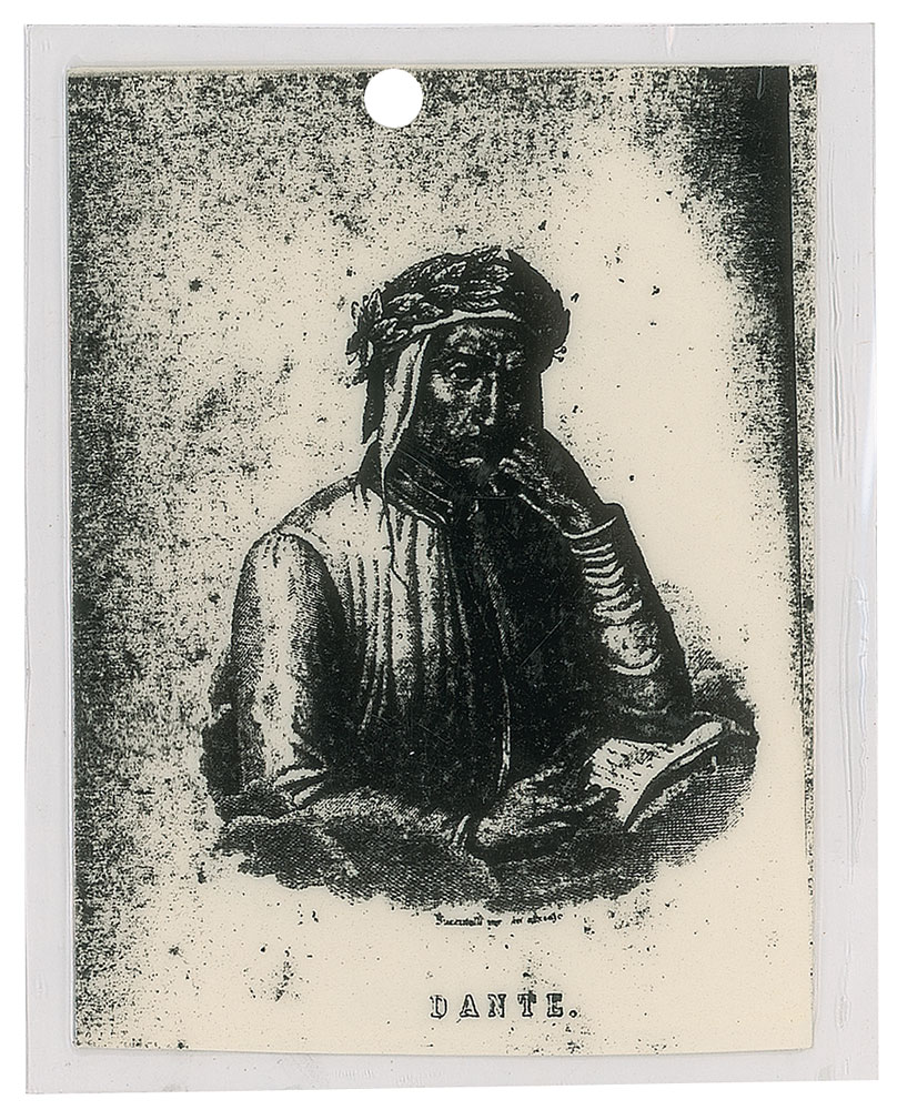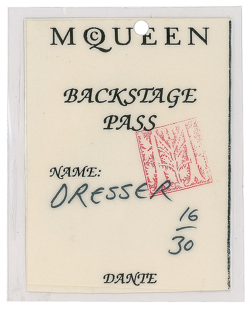 Official laminated 3.25″ x 4″backstage pass for Alexander McQueen's memorable 'Dante' fashion show, intricately staged inside London's candlelit Christ Church Spitalfields on March 1, 1996, as part of the designer’s Autumn/Winter 1996 collection. The front of the pass depicts an image of Dante in thoughtful pose, with the reverse reading, “McQueen, Backstage Pass, Name, Dante,” marked in black felt tip, “Dresser, 16/30,” and bearing a red ‘M’ stamp. In fine condition. The collection was named for the 14th-century Italian poet Dante Alighieri, whose Divine Comedy portrays an allegorical vision of the afterlife; the show, in the words of McQueen, was about 'war and peace through the years.' According to his collaborator Philip Treacy, Dante was the show that elevated McQueen’s career to the international level: 'The thing is, everybody loves Alexander now, but they didn’t at the beginning?when he did that show, suddenly people could see his potential, because it was beautifully done.' From The Alexander McQueen Archive of Ruti Danan. Learn more about Alexander McQueen.