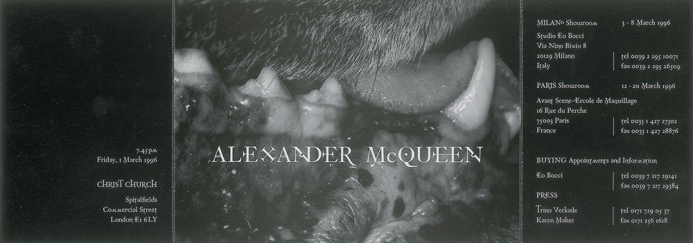 Official tri-fold invitation for Alexander McQueen's memorable 'Dante' fashion show, intricately staged inside London's candlelit Christ Church Spitalfields on March 1, 1996, as part of the designer’s Autumn/Winter 1996 collection. The front, or exterior, of the invitation, measuring 11.75″ x 4″ unfolded, depicts a series of four Baroque-style angels, with dedication to magazine editor Isabella Blow, and a black felt tip notation, “Guest of Rose”; the reverse, or interior, shows the close-up image of a dog’s mouth with white text, “Alexander McQueen,” and the adjacent panels featuring date, venue, and contact information in white text against a black background. In fine condition. The collection was named for the 14th-century Italian poet Dante Alighieri, whose Divine Comedy portrays an allegorical vision of the afterlife; the show, in the words of McQueen, was about 'war and peace through the years.' According to his collaborator Philip Treacy, Dante was the show that elevated McQueen’s career to the international level: 'The thing is, everybody loves Alexander now, but they didn’t at the beginning?when he did that show, suddenly people could see his potential, because it was beautifully done.' From The Alexander McQueen Archive of Ruti Danan. Learn more about Alexander McQueen.