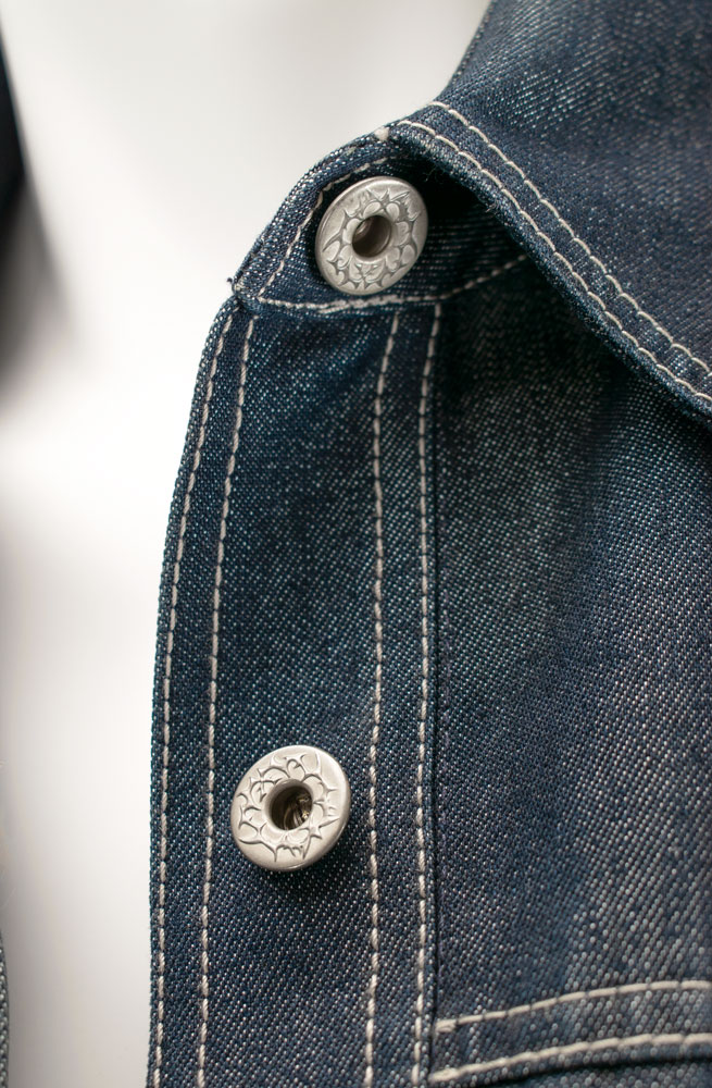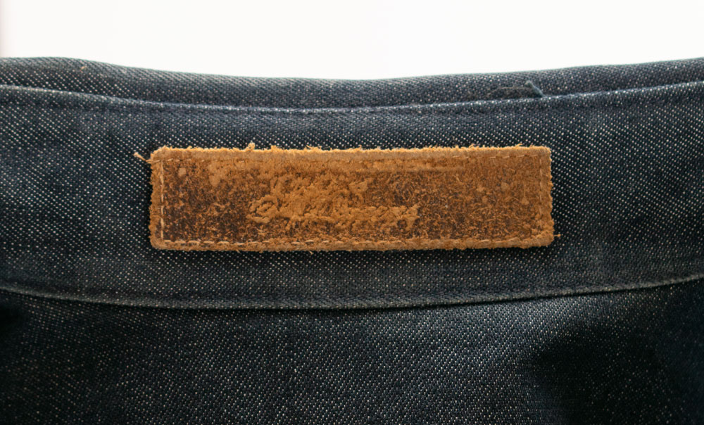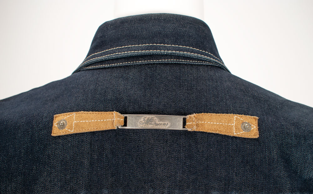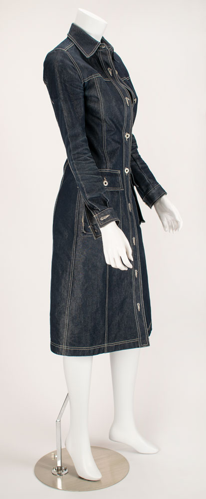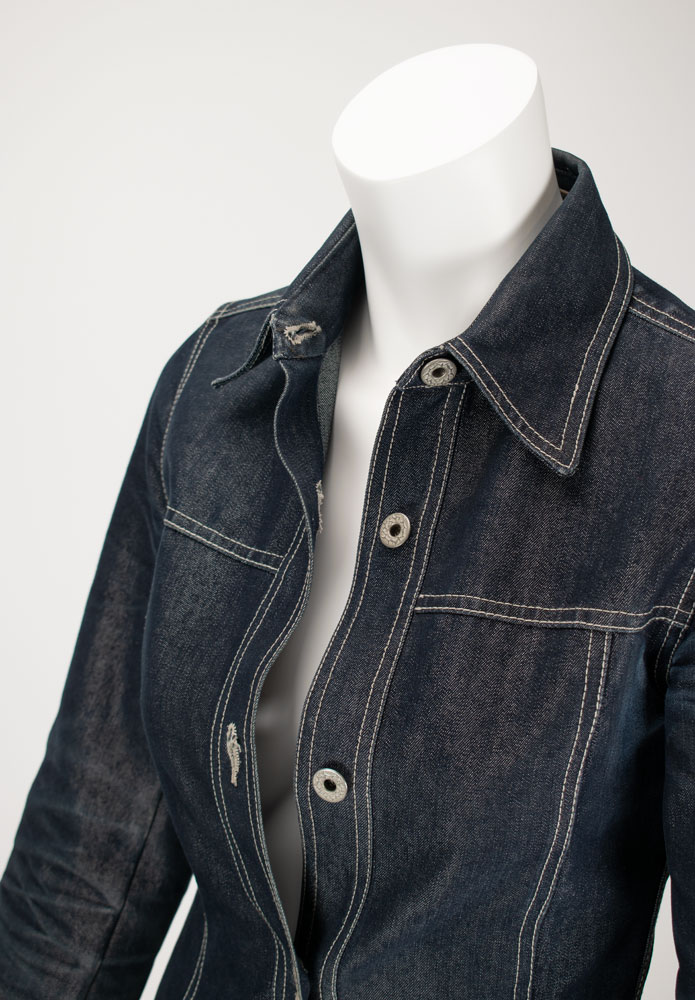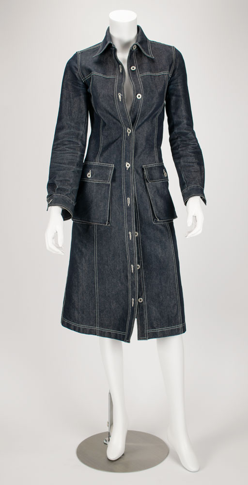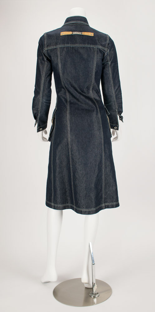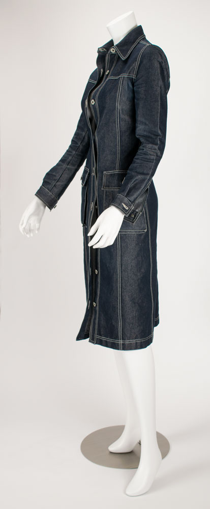 A long-line denim jacket with logo buttons from the "McQueen's" denim line. This diffusion line was launched by McQueen in 1999, and made it’s debut in the AW 1999 catwalk collection "Eshu." The back features the leather strap with branding. From The Alexander McQueen Archive of Ruti Danan. Learn more about Alexander McQueen.