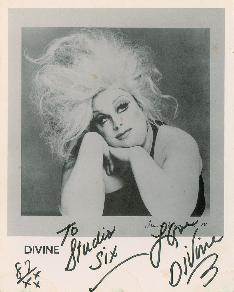 American actor, singer, and drag queen (1945-1988). Cardstock 8 x 10 promo photo, signed and inscribed in black felt tip, "To Studio Six, Love, Divine, 87/xxx.” In very good to fine condition, with scattered small stains to the images, and light dampstaining to the lower border.