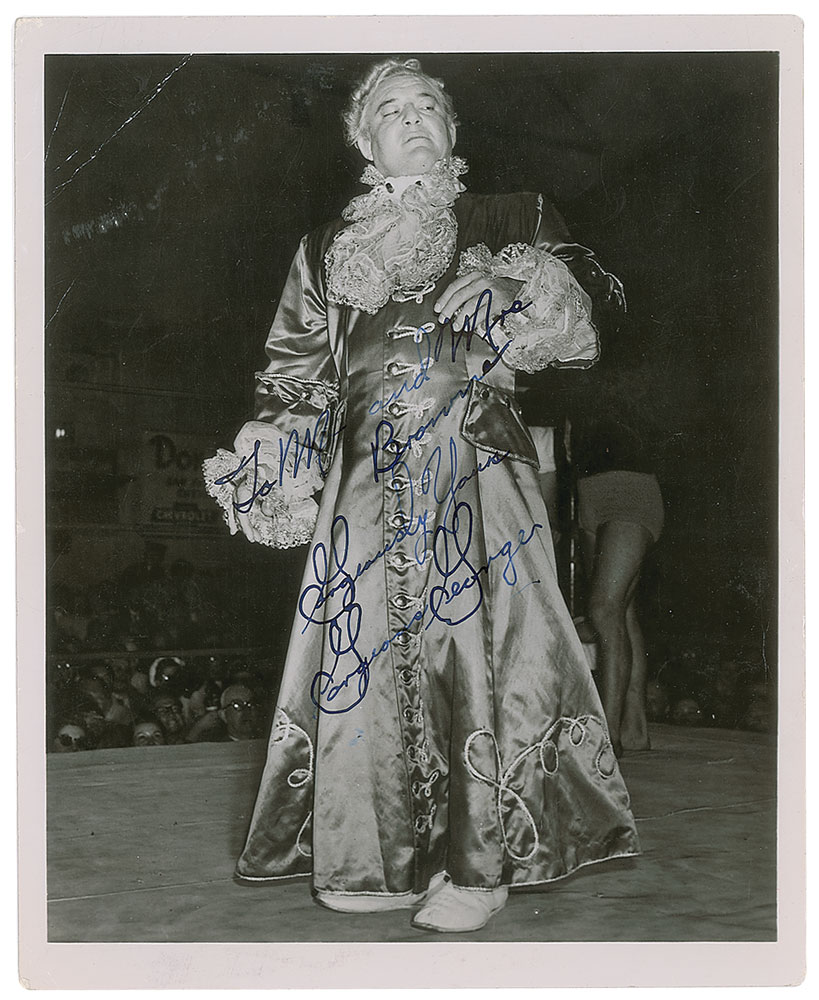 Professional wrestler, born George Raymond Wagner (1915-1963), who gained mainstream popularity and became one of the biggest stars of the Golden Age of Wrestling. Excellent vintage glossy 8 x 10 full-length photo of the flamboyant wrestling legend in full costume during a 1954 match, signed and inscribed in blue fountain pen, "To Mr. and Mrs. Browne, Gorgeously Yours, Gorgeous George.” Typed notation to reverse dates the signature to February 1956. In very good to fine condition, with scattered light creasing, a heavier crease to the upper left corner, and light surface impressions from typed notations on the back.