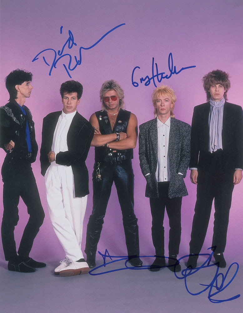 Color satin-finish 11 x 14 photo of The Cars standing against a pink background, signed in blue felt tip by Ric Ocasek, Elliot Easton, David Robinson, and Greg Hawkes. In fine condition.