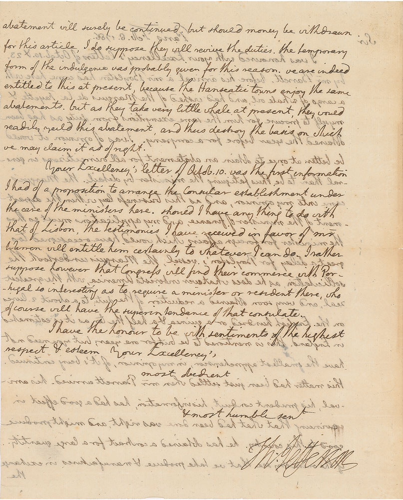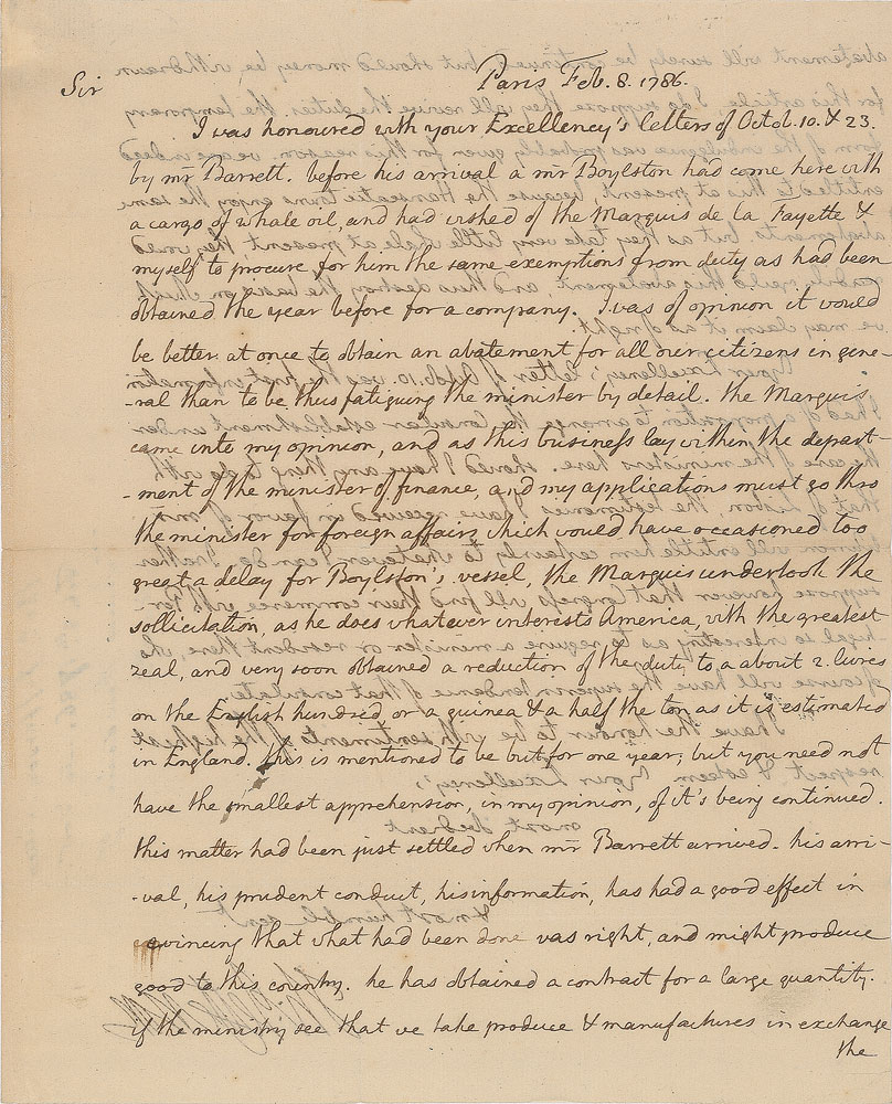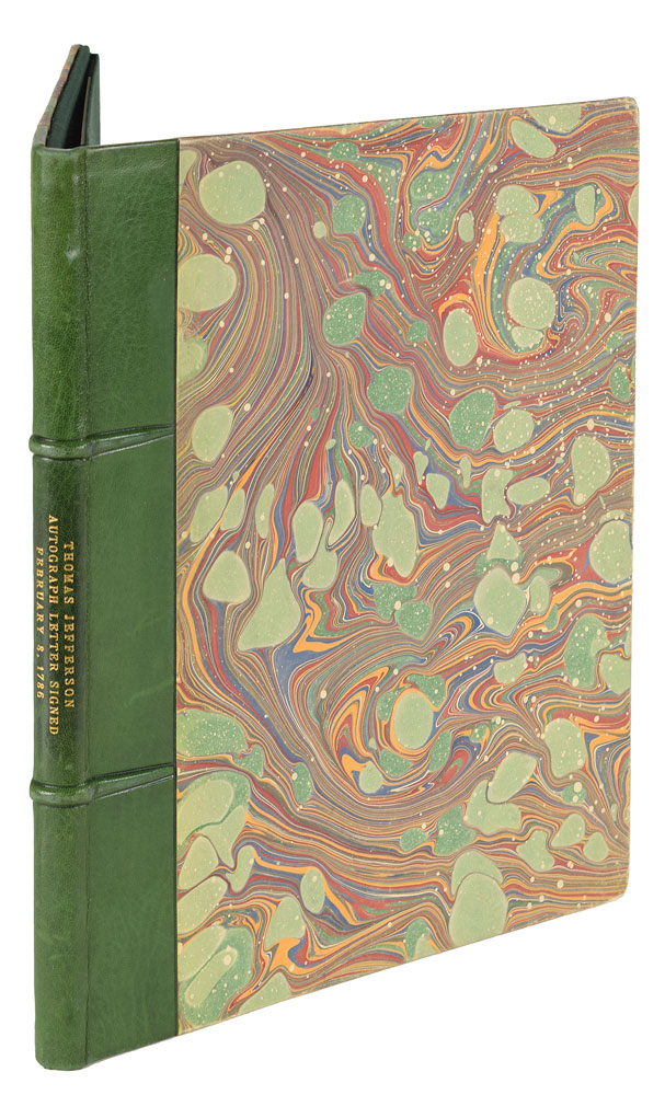 Handwritten letter signed “Th: Jefferson,” one page both sides, 7.25 x 9, February 8, 1786. Letter to Governor James Bowdoin of Massachusetts, written from Paris while serving as minister to France. In part: "I was honoured with your Excellency's letters of Octob. 10 & 23 by Mr. Barrett. Before his arrival a Mr. Boylston had come here with a cargo of whale oil, and had wished of the Marquis de la Fayette & myself to procure for him the same exemptions from duty as had been obtained the year before for a company. I was of opinion it would be better at once to obtain an abatement for all our citizens in general than to be thus fatiguing the minister by detail. The Marquis came into my opinion, and as this business lay within the department of the minister of finance, and my applications must go thro' the minister for foreign affairs which would have occasioned too great a delay for Boylston’s vessel, the Marquis undertook the solicitation, as he does whatever interests America, with the greatest zeal, and very soon obtained a reduction of the duty to about 2 livres on the English hundred, or a guinea & a half the ton as it is estimated in England. This is mentioned to be but for one year; but you need not have the smallest apprehension, in my opinion, of it’s being continued. This matter had been just settled when Mr. Barrett arrived. His arrival, his prudent conduct, his information, has had a good effect in convincing that what had been done was right, and might produce good to this country. He has obtained a contract for a large quantity if the ministry see that we take produce & manufactures in exchange the abatement will surely be continued. But should money be withdrawn for this article, I do suppose they will revive the duties. The temporary form of the indulgence was probably given for this reason. We are indeed entitled to this at present, because the Hanseatic towns enjoy the same abatements. But as they take very little whale at present, they would readily yield this abatement, and thus destroy the basis on which we may claim it as of right." In fine condition. Accompanied by a beautiful custom-made presentation folder with a quarter leather binding.