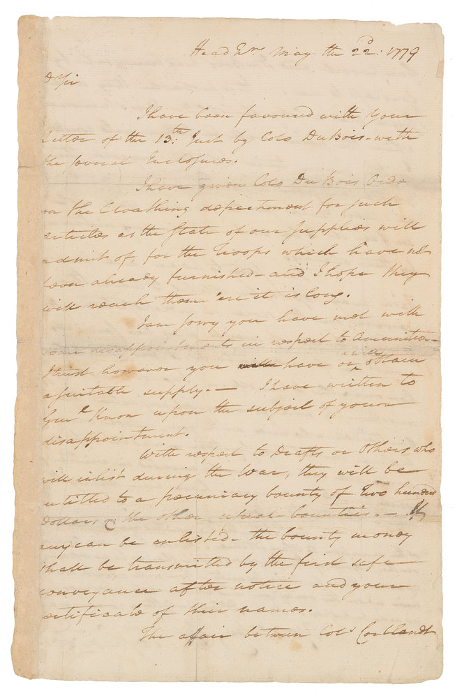 In this remarkable letter, Washington writes about resupplying his troops in response to recurring Indian raids on the northern frontier. This was part of the buildup for the ‘Sullivan Expedition,’ led by Major General John Sullivan against a combined force of Indians and Tories throughout the summer of 1779. Two days later, on May 24th, Washington formally placed the recipient of this letter, Brigadier General James Clinton, under Sullivan’s command. Their famous campaign against the Iroquois Confederacy (also known as the ‘Sullivan-Clinton Expedition’) began shortly thereafter, with a goal of ‘taking the war home to the enemy to break their morale.’ Only one major battle was fought during the expedition, at Newtown on August 29, 1779—it was an American victory, and the campaign succeeded in its scorched-earth disruption of the Iroquois. A superb letter by Washington as he oversees the logistical organization of the upcoming campaign.