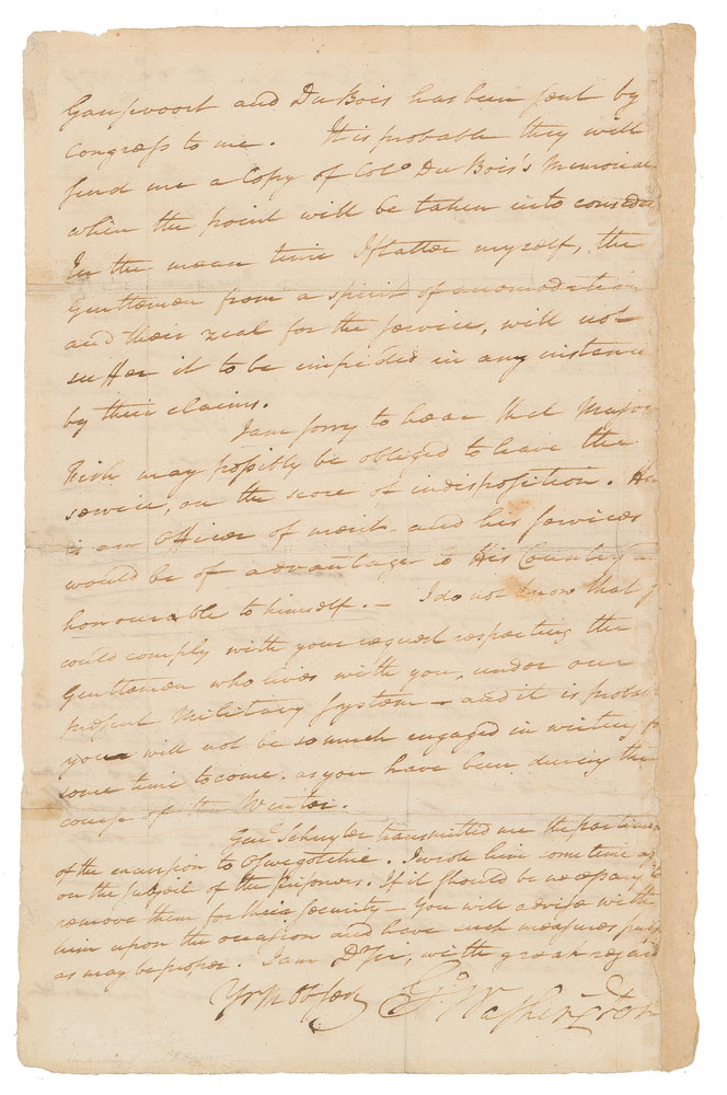 General [Philip] Schuyler transmitted me the particulars of the Excursion to Oswegatchie. I wrote him some time ago on the subject of the prisoners. If it should be necessary to remove them for their security—you will advise with him upon the occasion, and have such measures pursued as may be proper." In fine condition, with an old mounting strip along the edge, impinging on the ends of some of the sentences. Accompanied by a beautiful custom-made presentation folder with a quarter leather binding.