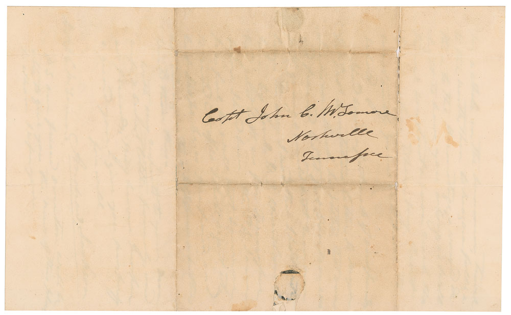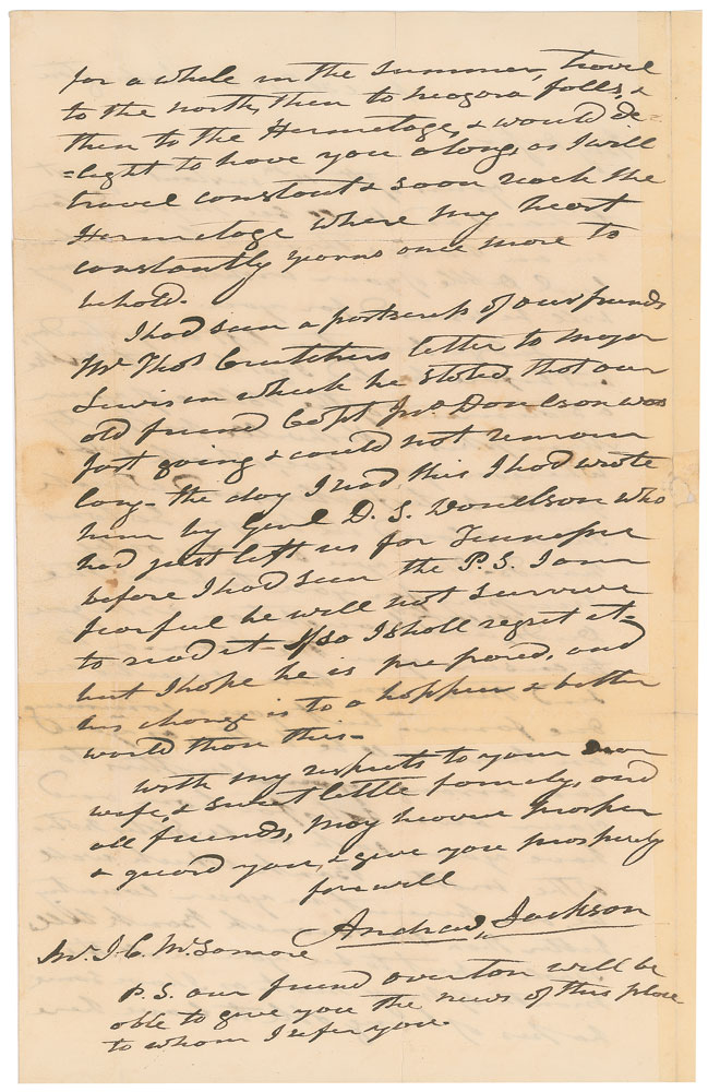 ALS as president, one page both sides, 7.75 x 12.5, April 30, 1830. Letter to West Tennessee land speculator John C. McLemore, in part: "Yours of the 15th instant is just to hand, and I will see Major Eaton in an hour & through him inform Gen'l Dibble of your wishes. The money will be reserved for you. Judge Overton left us yesterday, but before he did, I got him to make a statement of the value of your Memphis & Nashville property whereon you live, which was quite satisfactory, and which I have placed in Major Eaton's hands. Thus you see it is only?for you to have the deeds executed and brought on with you to ensure you the loan or to send them on here executed in due form, but your coming on here will be better, as you can arrange your matters to your own satisfaction and have your cost in N. States notes of the mother bank which will be, one percent, in your county, better than the branch bank will. I shall expect to see you in all the month of May next, as I have some hopes of being able to leave here for a while in the summer, travel to the north, then to Niagara Falls, & then to the Hermitage, & would delight to have you along as I will travel constant & soon reach the Hermitage where my heart constantly yearns once more to behold. I had seen a postscript of our friend Mr. Thos. Crutchers' letter to Major Lewis in which he stated that our old friend Capt. Jno. Donelson was just going & could not remain long, the day I had, this I had wrote him by Gen'l D. S. Donelson who had just left us for Tennessee before I had seen the P.S. I am fearful he will not survive to read it. If so I shall regret it, but I hope he is prepared, and his change is to a happier & better world than this." In very good to fine condition, with tape along the inner hinge and to several folds, and easily repairable nearly complete separation along the top horizontal fold.