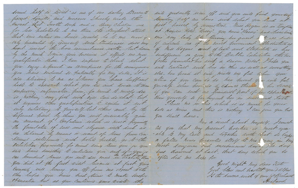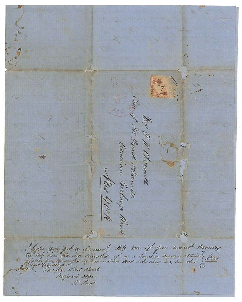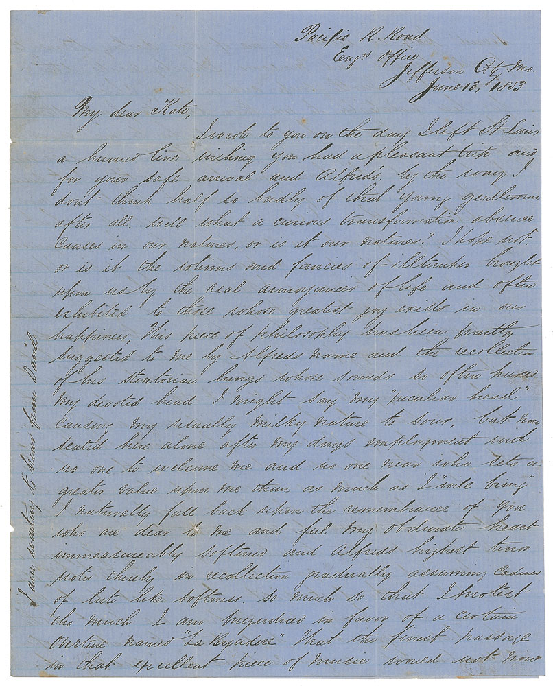 Handwritten letter from David O'Donnell of the Pacific Railroad Company, three pages on two adjoining sheets, 8 x 10, June 13, 1853. Penned from the engineer's office in Jefferson County, Missouri, a lengthy and poetic letter to his wife Kate, in part: "I write to you on the day I left St. Louis a hurried line wishing you had a pleasant tip and for your safe arrival and Alfred's. By the way I don't think half so badly of that young gentleman after all. Well what a curious transformation absence causes in our natures, or is it our natures??Now a word about myself, I must tell you that my present position is most agreeable to my taste and together with that so bright a future never presents itself to me even in my most sanguine and inexperienced days. The day has dawned at last, that day which you so often bid me hope for." In very good to fine condition, with paper loss along fold intersections on the last page.