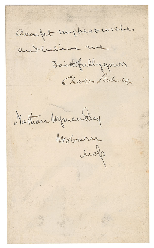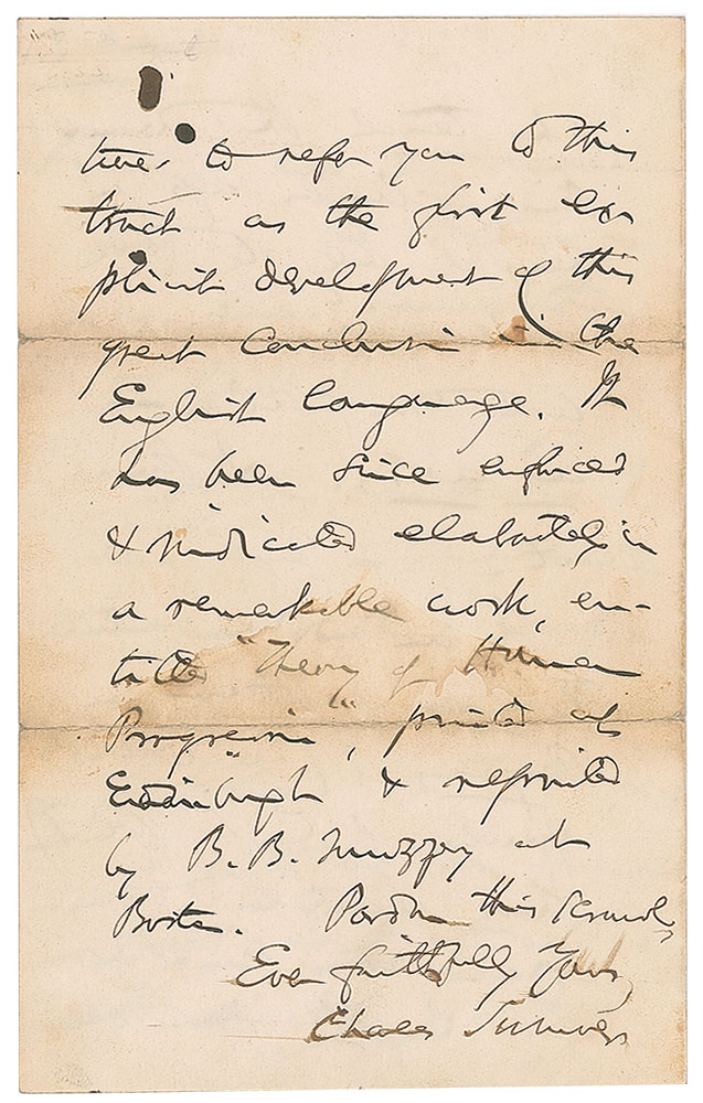 Two letters: ALS, four pages on two adjoining sheets, 5 x 8, October 31, 1856, discussing political philosophy, in part: "Vico, Michelet, & others who teach mankind climbs up a length only to fall back again, err"; and a partial LS, one page, 5 x 8, March 30, 1863, in part: "Accept my best wishes and believe me." In very good to fine condition, with scattered staining, and mounting remnants on the back of the signature.