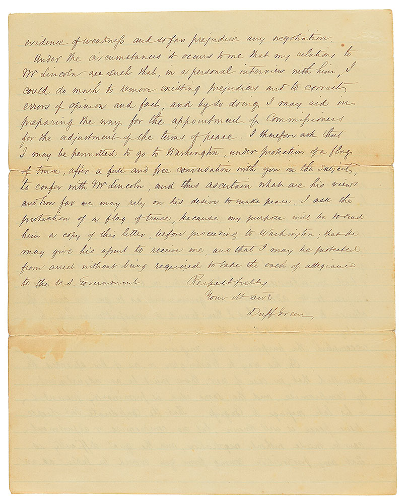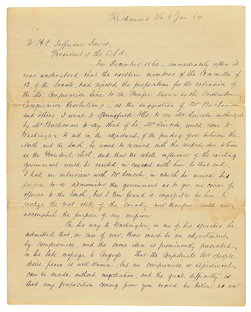 The referenced letter to Davis, one page, both sides, 7.75 x 9.75, in part: "I went to Springfield, Ills., to see Mr. Lincoln, authorized by Mr. Buchanan, to say that if he, Mr. Lincoln, would come to Washington to aid in the adjustment of the pending issue between the North and the South, he would be received with the respect due to him as the President elect?I had an interview with Mr. Lincoln, in which he avowed his purpose to so administer the government as to give no cause of offence to the South; but I then found it impossible for him to realize the real state of the country and therefore could not accomplish the purpose of my mission?Under the circumstances it occurs to me that my relations to Mr. Lincoln are such that, in a personal interview with him, I could do much to remove existing prejudices and to correct errors of opinion and fact, and by so doing I may aid in preparing the way for the appointment of commissioners for the adjustment of the terms of peace. I therefore ask that I may be permitted to go to Washington, under protection of a flag of truce, after a full and free conversation with you on the subject, to confer with Mr. Lincoln, and thus ascertain what are his views and how far we may rely on his desire to make peace." In overall very good to fine condition, with fold splits and light stains to both letters, and some creasing to the letter to Lincoln.