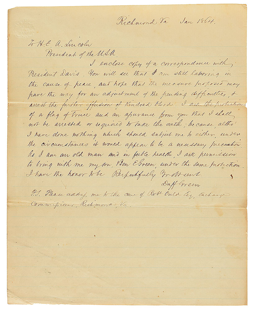 American journalist, industrialist, and businessman (1791-1875) who served as a benefactor for the Confederate Army. Fascinating pair of Civil War-dated ALSs from Duff Green, one addressed to U. S. President Abraham Lincoln, and the other to Confederate President Jefferson Davis, both dated January 1864. The letter to Lincoln, one page, 7.75 x 9.75, in full: "I enclose copy of a correspondence with President Davis. You will see that I am still laboring in the cause of peace, and hope that the measure proposed may pave the way for an adjustment of the pending difficulties, & arrest the further effusion of kindred blood. I ask the protection of a flag of Truce and an assurance from you that I shall not be arrested or required to take the oath; because, altho' I have done nothing which should subject me to either, under the circumstances it would appear to be a necessary precaution. As I am an old man and in feeble health, I ask permission to bring with me my son, Ben E. Green under the same protection."
