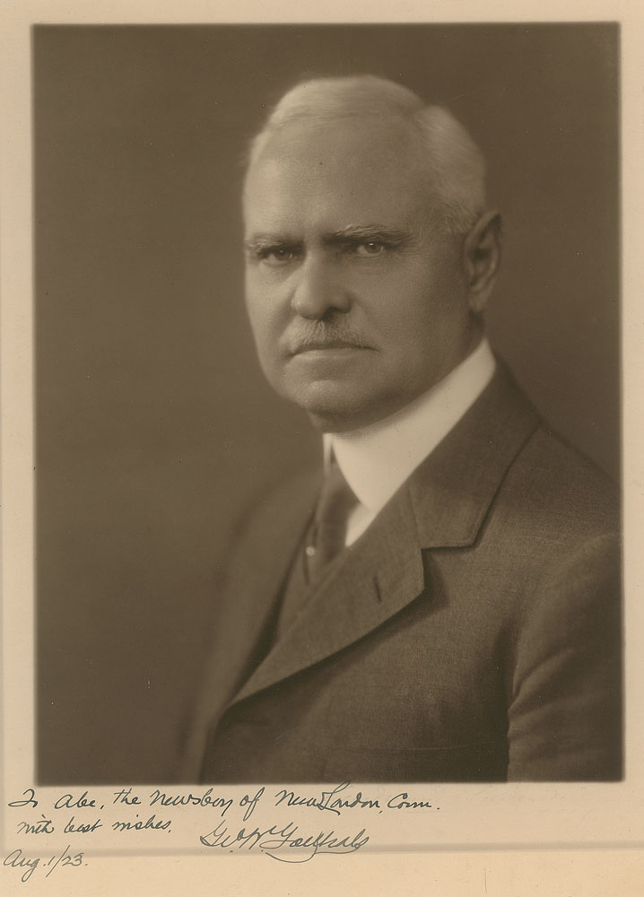 Army officer and civil engineer (1858-1929) appointed by Theodore Roosevelt to oversee the construction of the Panama Canal. Vintage matte-finish 7.75 x 10.75 photo of George Washington Goethals, signed and inscribed in the lower border in fountain pen, "To Abe, the newsboy of New London, Conn., with best wishes, Geo. W. Goethals, Aug. 1/23.” In fine condition, with tastefully trimmed edges. From the collection of Dr. Lawrence E. Miller.