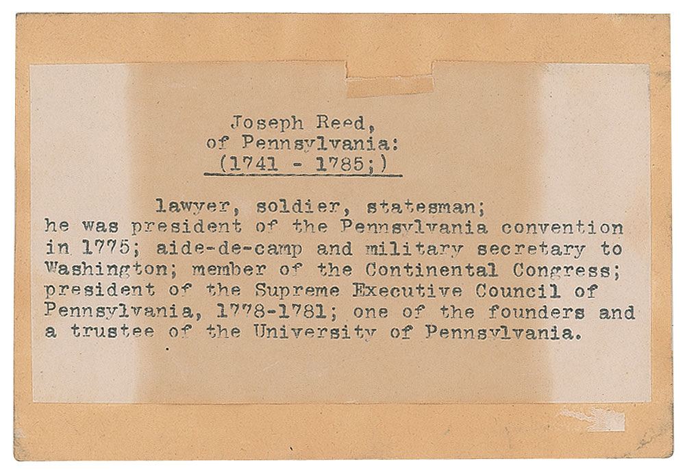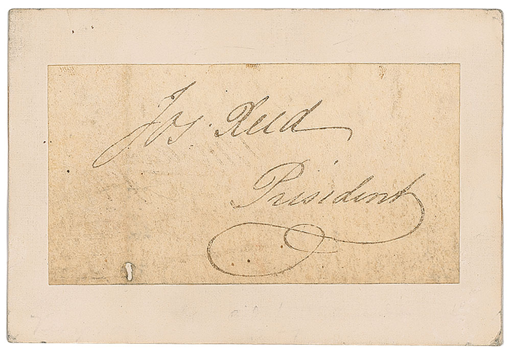 A president of the Continental Congress and signer of the Articles of Confederation (1741-1785) who also served as Washington's aide-de-camp during the Revolutionary War. Ink signature, "Jos. Reed, President,” on an off-white 5.25 x 3.5 sheet affixed to a slightly larger card. In very good to fine condition, with light overall soiling, and a small hole at the lower edge. From the collection of Dr. Lawrence E. Miller.