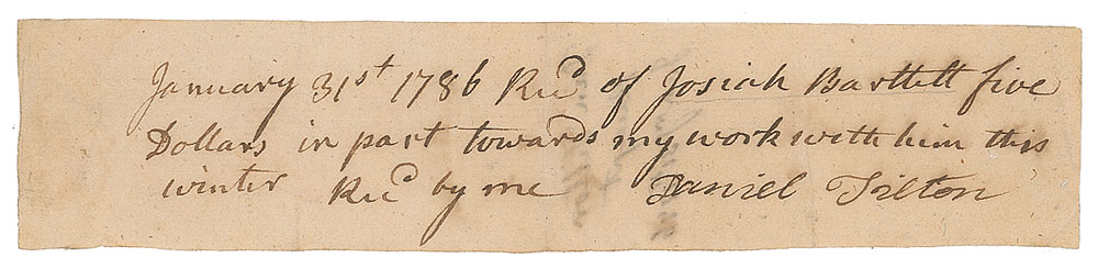 Physician and signer of the Declaration of Independence from New Hampshire (1729-1795) who served as that state's governor from 1790 to 1794. Third-person ADS, signed within the text, "Josiah Bartlett," one page, 7.25 x 1.5, January 31, 1786. Payment receipt, which reads: "Rec'd of Josiah Bartlett five Dollars in part towards my work with him this winter. Rec'd by me." Signed at the conclusion by Daniel Tilton, a New Hampshire and one of the three first judges of the Mississippi Territory Supreme Court, who was also the deliverer of the first Territorial Seal of Mississippi. In fine condition. From the collection of Dr. Lawrence E. Miller.