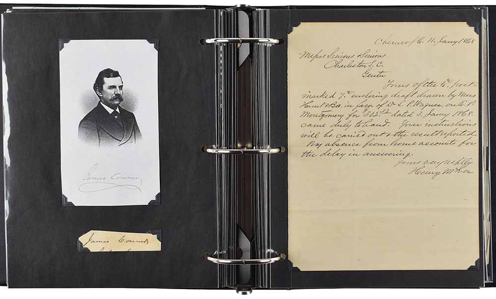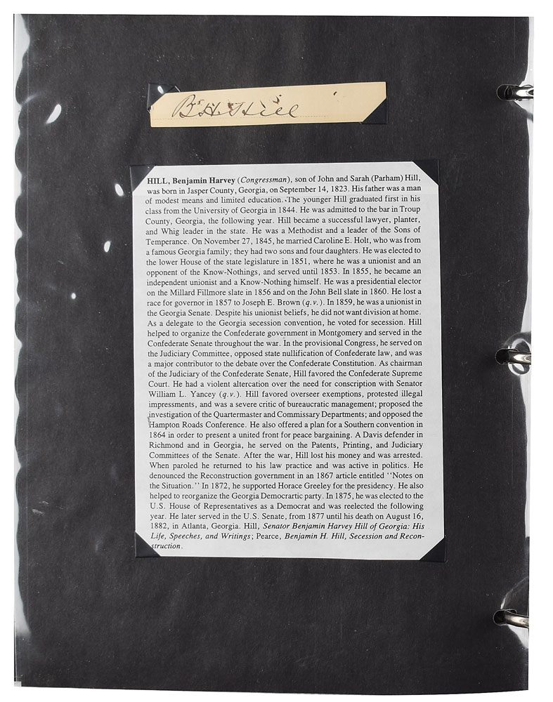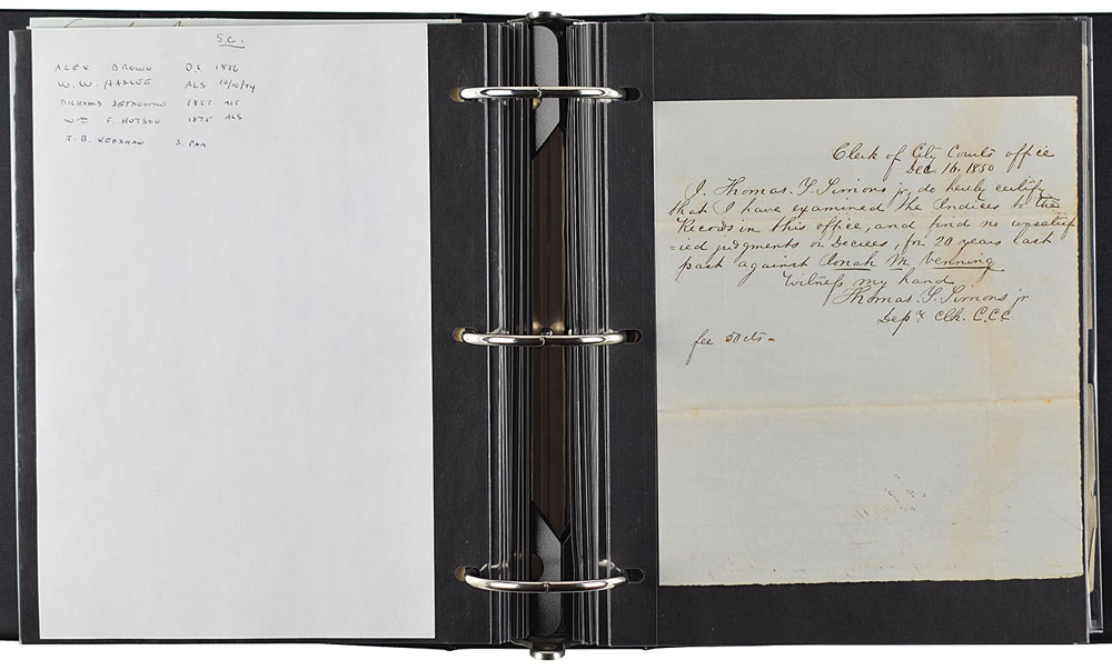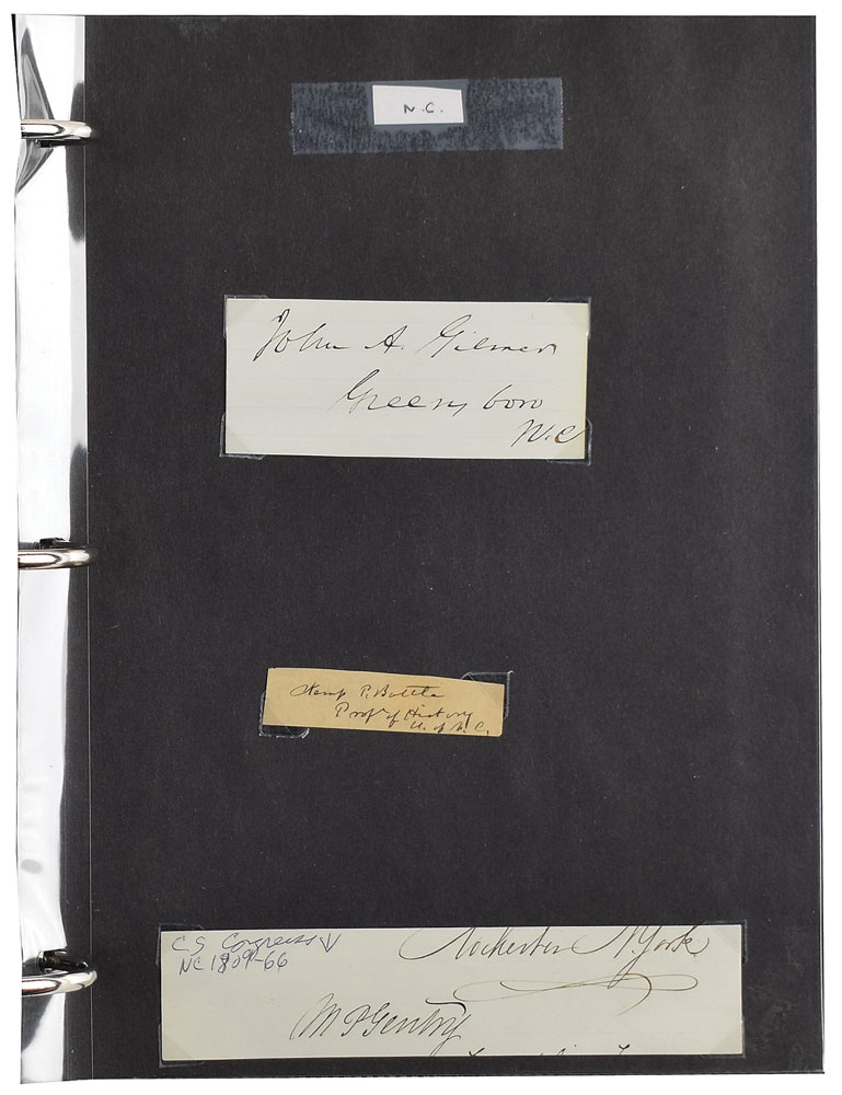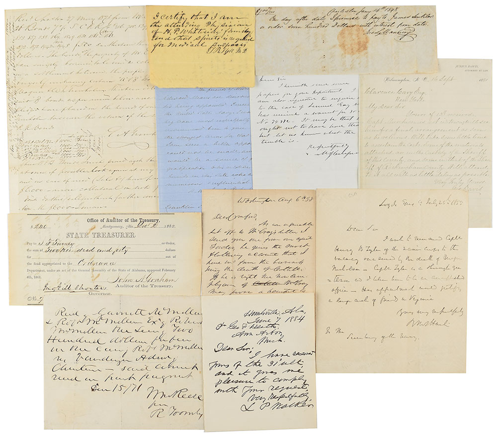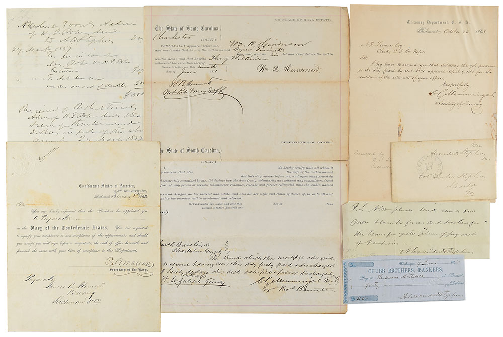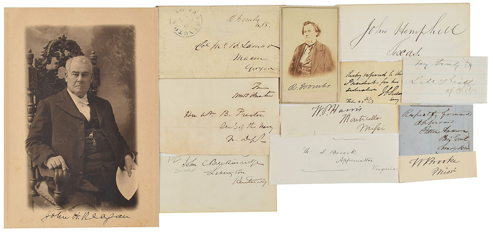 Highlights include: James Patton Anderson (signature), Thomas S. Bocock (signature), William Waters Boyce (ALS), John C. Breckinridge (signature), Walker Brooke (signature), Martin Jenkins Crawford (ALS), George Davis (ALS), W. P. Harris (signature), John Hemphill (signature), Robert M. T. Hunter (ALS), Robert M. T. Hunter (free frank), Laurence M. Keitt (signature), Stephen R. Mallory (DS), John L. Manning (ADS), Christopher Memminger (DS and LS), John Henninger Reagan (SP), James A. Seddon (ANS), John Gill Shorter (DS), Alexander H. Stephens (two ADSs, ANS, and check), Robert Toombs (ALS, free frank, and signed CDV), George Trenholm (ADS), LeRoy Pope Walker (ALS), and Thomas H. Watts (AES).