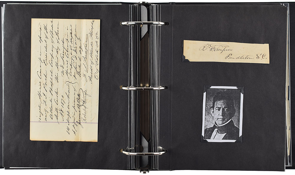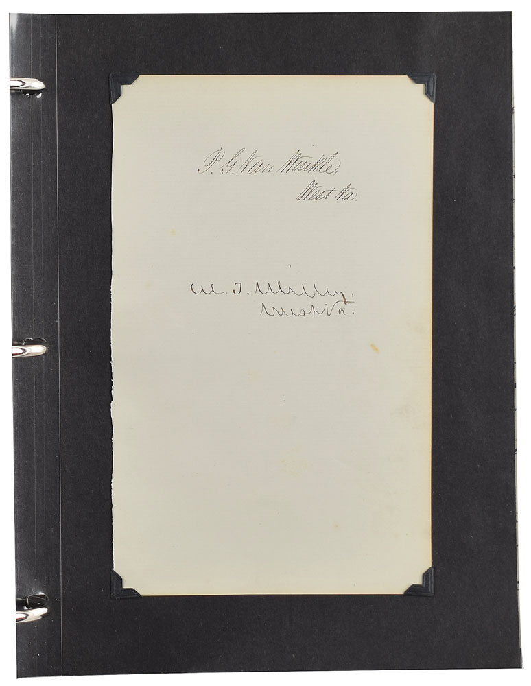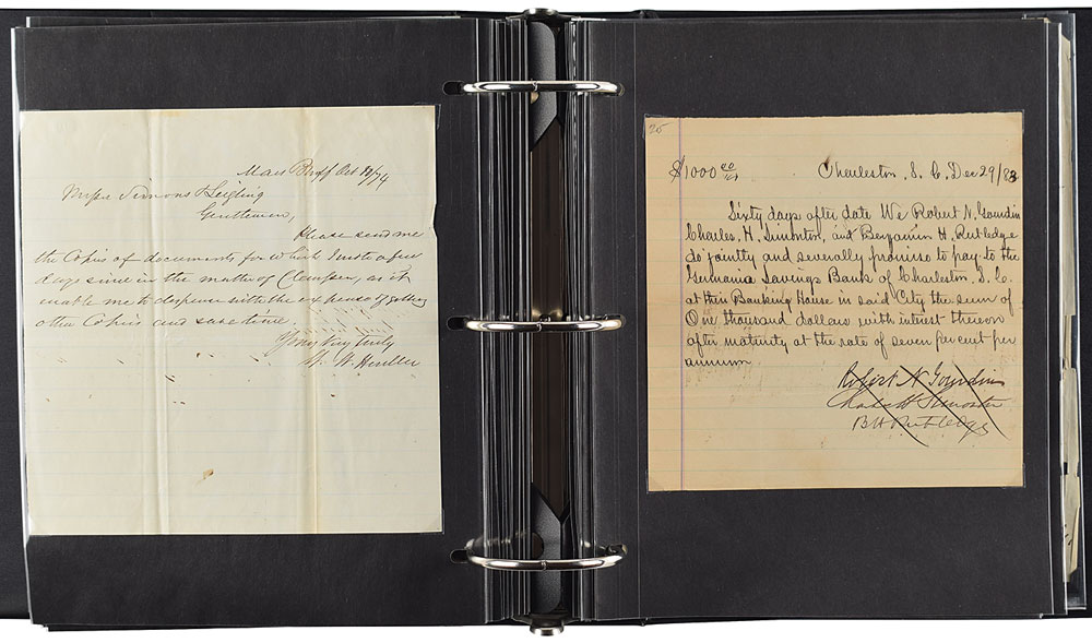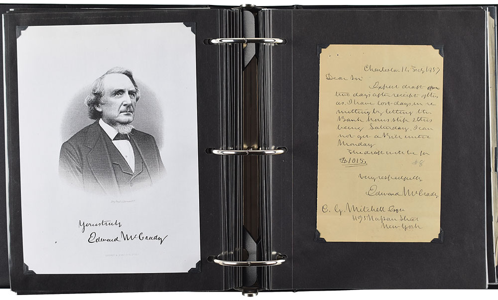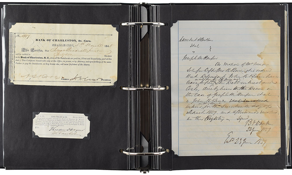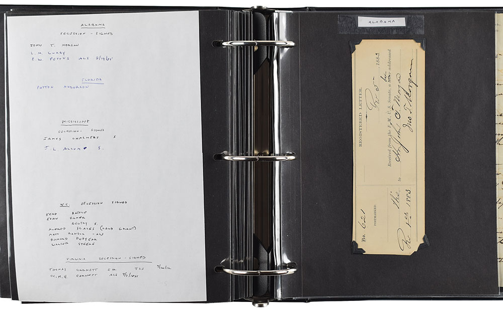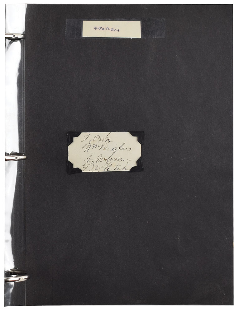 Highlights include: James Patton Anderson (signature), Thomas S. Bocock (signature), William Waters Boyce (ALS), John C. Breckinridge (signature), Walker Brooke (signature), Martin Jenkins Crawford (ALS), George Davis (ALS), W. P. Harris (signature), John Hemphill (signature), Robert M. T. Hunter (ALS), Robert M. T. Hunter (free frank), Laurence M. Keitt (signature), Stephen R. Mallory (DS), John L. Manning (ADS), Christopher Memminger (DS and LS), John Henninger Reagan (SP), James A. Seddon (ANS), John Gill Shorter (DS), Alexander H. Stephens (two ADSs, ANS, and check), Robert Toombs (ALS, free frank, and signed CDV), George Trenholm (ADS), LeRoy Pope Walker (ALS), and Thomas H. Watts (AES).